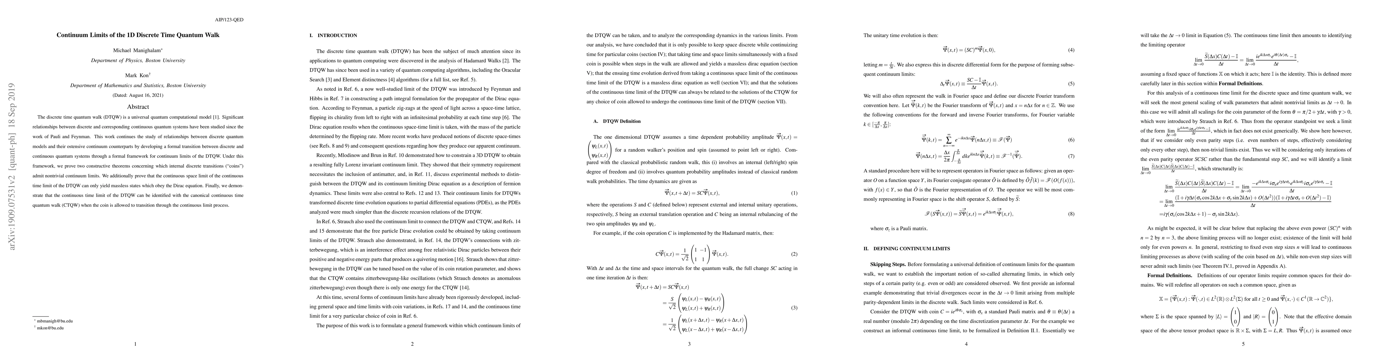 This paper develops a formal framework for continuum limits of the 1D discrete time quantum walk (DTQW) and proves two theorems on which discrete transitions admit nontrivial continuum limits. It also shows that the continuous space limit of the continuous time limit of the DTQW yields massless states obeying the Dirac equation and identifies the continuous time limit of the DTQW with the canonical continuous time quantum walk (CTQW).