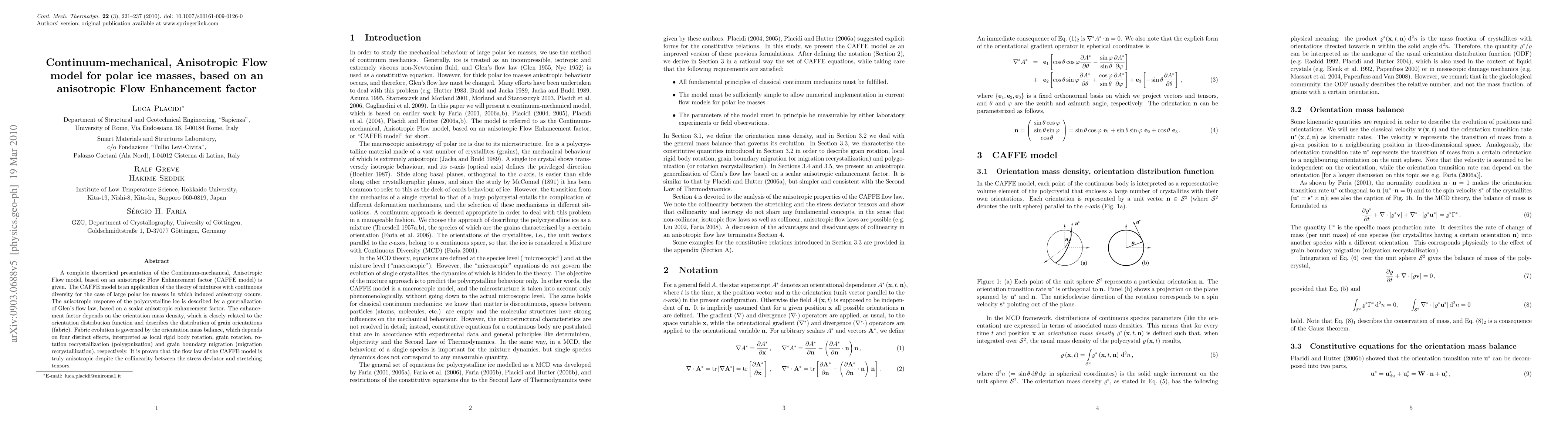 This paper presents a continuum-mechanical anisotropic flow model (CAFFE model) for large polar ice masses, based on an anisotropic flow enhancement factor. The model describes the anisotropic response of polycrystalline ice using a generalized Glen's flow law and accounts for fabric evolution through orientation mass balance, influenced by various recrystallization processes.