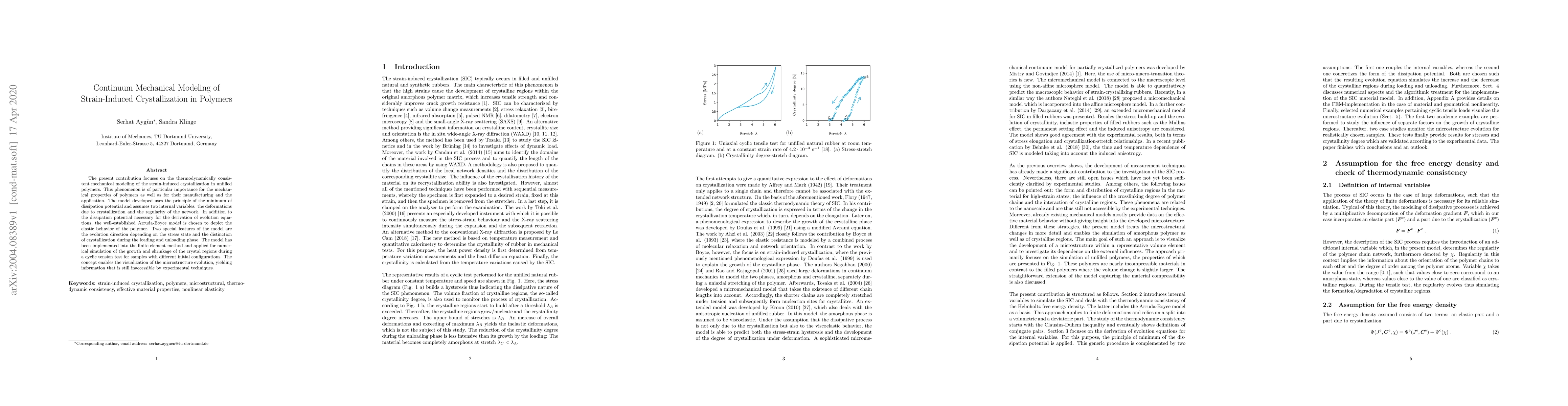 The present contribution focuses on the thermodynamically consistent mechanical modeling of the strain-induced crystallization in unfilled polymers. This phenomenon is of particular importance for the mechanical properties of polymers as well as for their manufacturing and the application. The model developed uses the principle of the minimum of dissipation potential and assumes two internal variables: the deformations due to crystallization and the regularity of the network. In addition to the dissipation potential necessary for the derivation of evolution equations, the well-established Arruda-Boyce model is chosen to depict the elastic behavior of the polymer. Two special features of the model are the evolution direction depending on the stress state and the distinction of crystallization during the loading and unloading phase. The model has been implemented into the finite element method and applied for numerical simulation of the growth and shrinkage of the crystal regions during a cyclic tension test for samples with different initial configurations. The concept enables the visualization of the microstructure evolution, yielding information that is still inaccessible by experimental techniques.