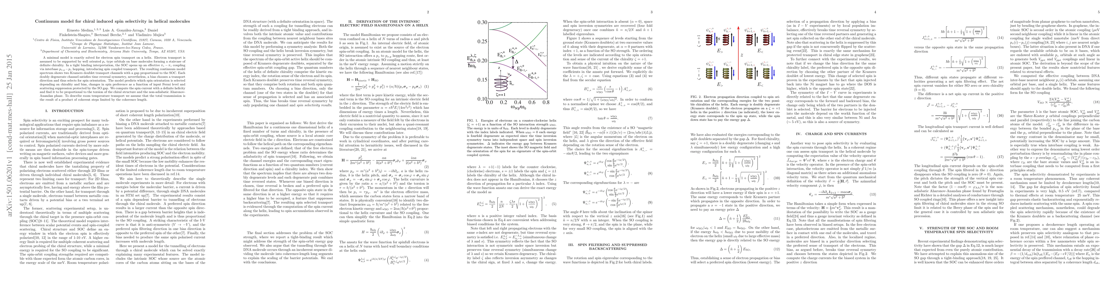 The paper presents a continuum model for chiral induced spin selectivity in helical molecules. It introduces a minimal model for electron spin transport on a helix, demonstrating that a bias chooses a transport direction and thus selects for spin orientation. The model predicts spin orientation selection based on chirality and bias, and calculates a spin current proportional to the torsion of the chiral structure and the non-adiabatic Aharonov-Anandan phase.