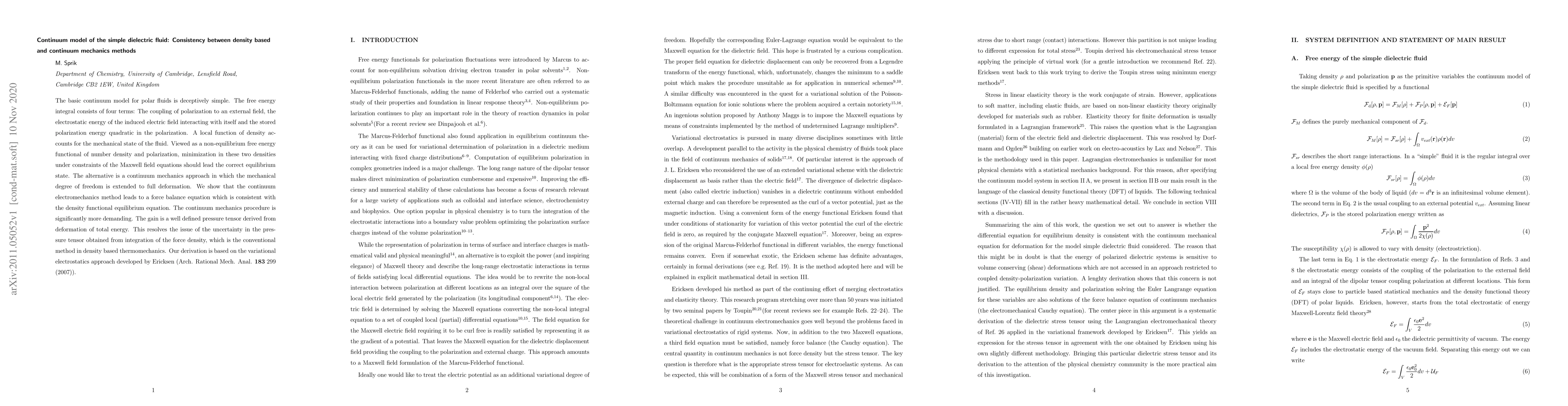 The basic continuum model for polar fluids is deceptively simple. The free energy integral consists of four terms: The coupling of polarization to an external field, the electrostatic energy of the induced electric field interacting with itself and the stored polarization energy quadratic in the polarization. A local function of density accounts for the mechanical state of the fluid. Viewed as a non-equilibrium free energy functional of number density and polarization, minimization in these two densities under constraints of the Maxwell field equations should lead the correct equilibrium state. The alternative is a continuum mechanics approach in which the mechanical degree of freedom is extended to full deformation. We show that the continuum electromechanics method leads to a force balance equation which is consistent with the density functional equilibrium equation. The continuum mechanics procedure is significantly more demanding. The gain is a well defined pressure tensor derived from deformation of total energy. This resolves the issue of the uncertainty in the pressure tensor obtained from integration of the force density, which is the conventional method in density based thermomechanics. Our derivation is based on the variational electrostatics approach developed by Ericksen (Arch. Rational Mech. Anal. {\bf 183} 299 (2007)).