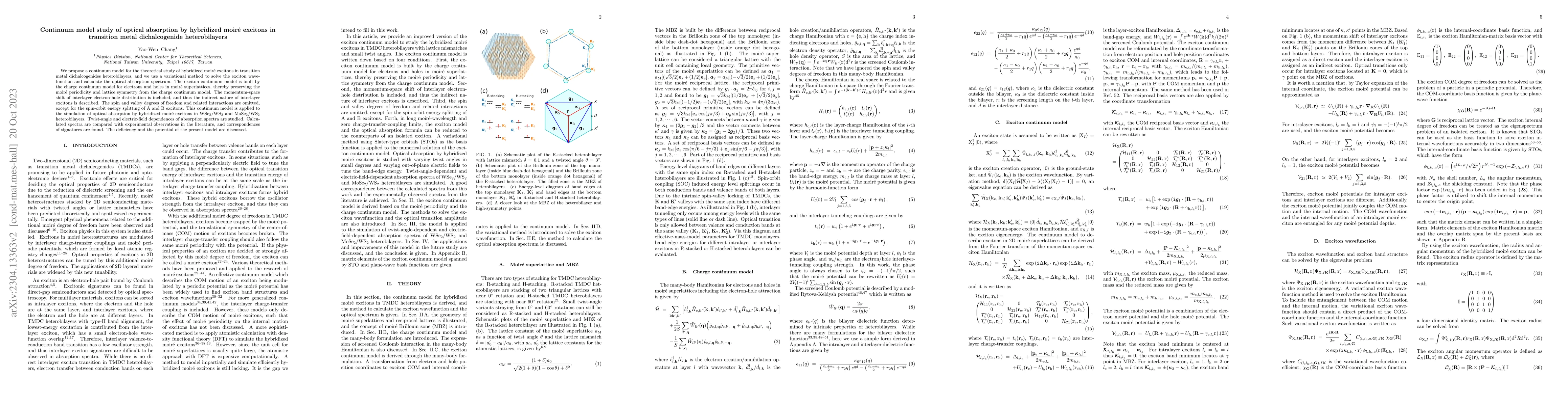 This paper presents a continuum model to study optical absorption by hybridized moiré excitons in transition metal dichalcogenide heterobilayers, solving for the exciton wavefunction and calculating absorption spectra. The model captures moiré periodicity and includes interlayer electron-hole distribution shifts, while comparing simulated spectra to experimental data to validate the model's applicability.