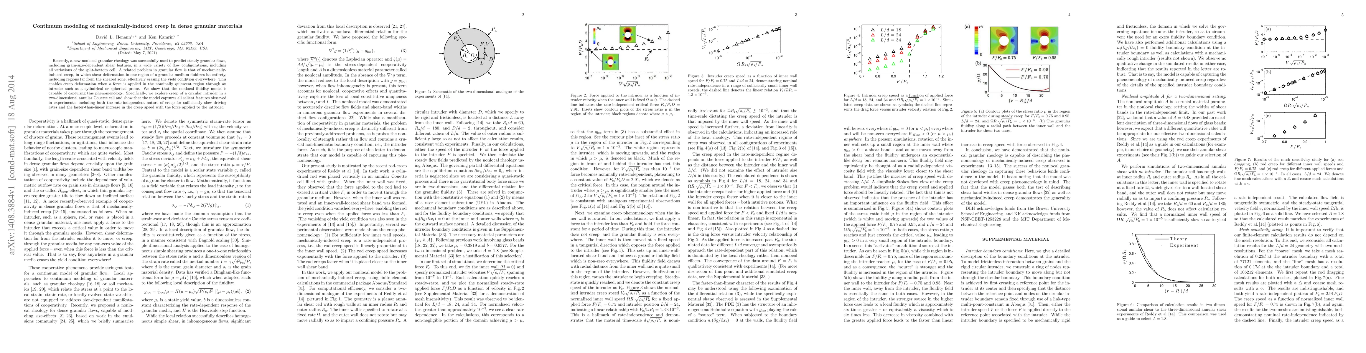 This paper presents a nonlocal granular rheology model that successfully predicts mechanically-induced creep in dense granular materials, capturing both the rate-independent nature of creep and the nonlinear increase in creep speed with applied force. The model is validated through experiments involving a circular intruder in a two-dimensional annular Couette cell.