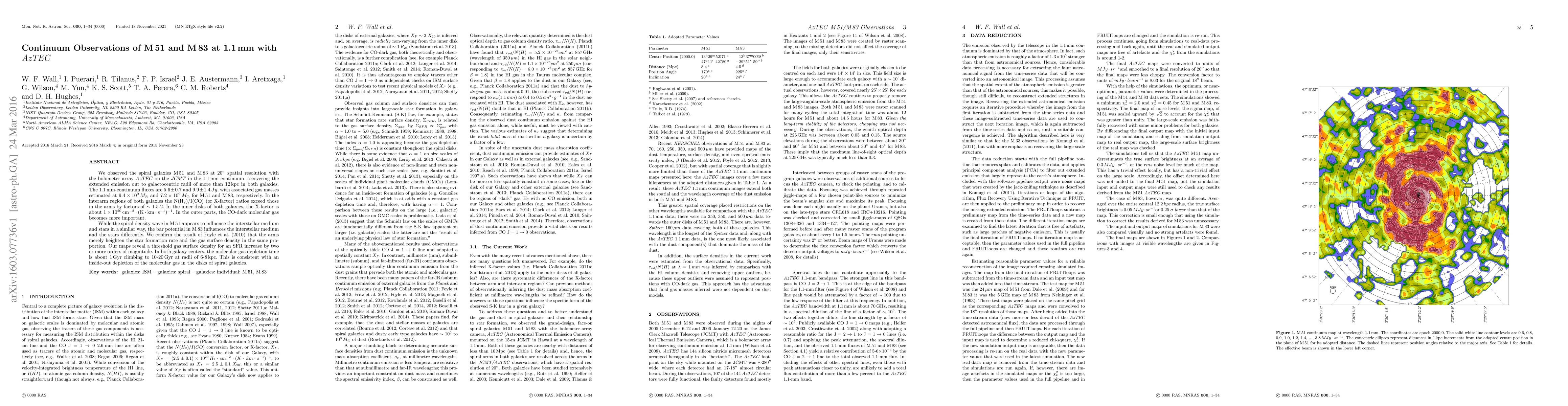 We observed the spiral galaxies M51 and M83 at 20" spatial resolution with the bolometer array AzTEC on the JCMT in the 1.1$\,$mm continuum, recovering the extended emission out to galactocentric radii of more than 12 kpc in both galaxies. The 1.1 mm-continuum fluxes are 5.6+/-0.7 and 9.9+/-1.4 Jy, with associated gas masses estimated at 9.4 X 10^9 Mo and 7.2 X 10^9 Mo for M51 and M83, respectively. In the interarm regions of both galaxies the N(H2)/I(CO) (or X-factor) ratios exceed those in the arms by factors of ~1.5-2. In the inner disks of both galaxies, the X-factor is about 1 X 10^20 cm^-2 / (K km s^-1). In the outer parts, the CO-dark molecular gas becomes more important. While the spiral density wave in M51 appears to influence the interstellar medium and stars in a similar way, the bar potential in M83 influences the interstellar medium and the stars differently. We confirm the result of Foyle et al. (2010) that the arms merely heighten the star formation rate and the gas surface density in the same proportion. Our maps reveal a threshold gas surface density for an SFR increase by two or more orders of magnitude. In both galaxy centers, the molecular gas depletion time is about 1 Gyr climbing to 10-20 Gyr at radii of 6-8 kpc. This is consistent with an inside-out depletion of the molecular gas in the disks of spiral galaxies.