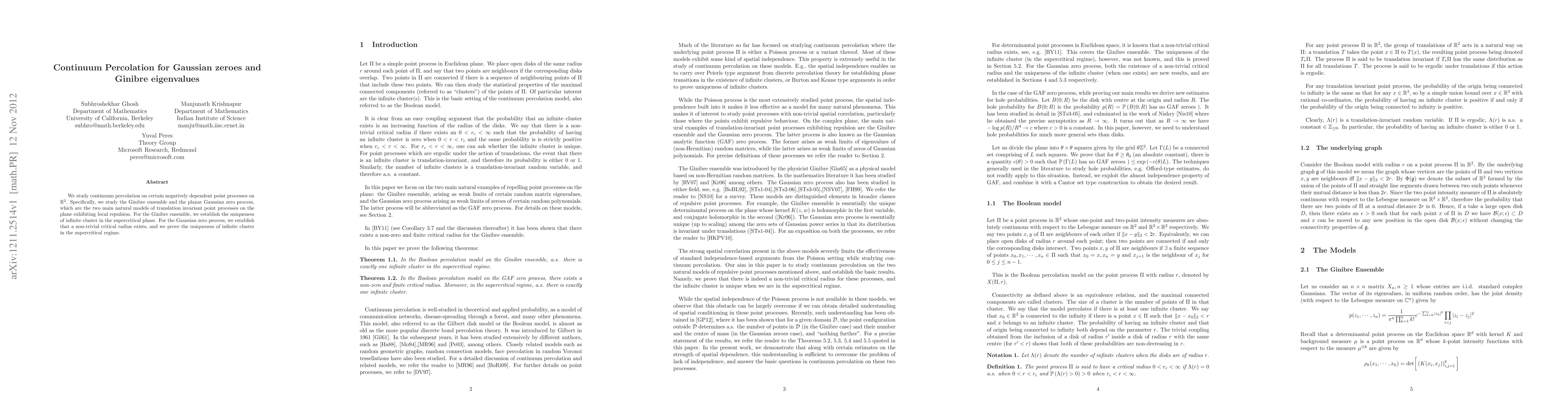 This paper investigates continuum percolation on two translation invariant point processes: the Ginibre ensemble and the Gaussian zero process. It establishes the uniqueness of infinite clusters in the supercritical phase for both models, and identifies a non-trivial critical radius for the Gaussian zero process.