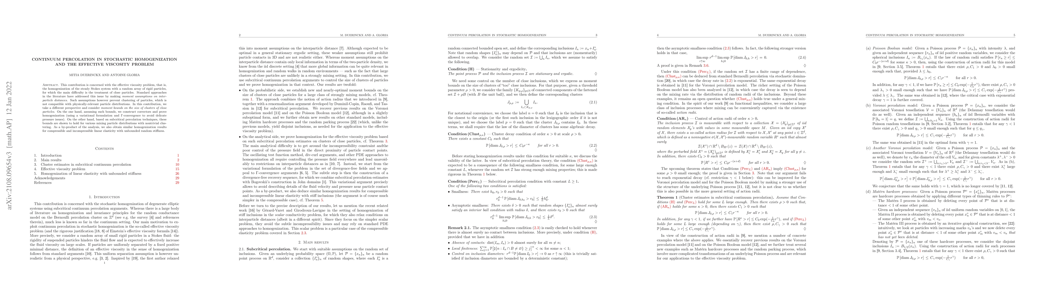 This contribution is concerned with the effective viscosity problem, that is, the homogenization of the steady Stokes system with a random array of rigid particles, for which the main difficulty is the treatment of close particles. Standard approaches in the literature have addressed this issue by making moment assumptions on interparticle distances. Such assumptions however prevent clustering of particles, which is not compatible with physically-relevant particle distributions. In this contribution, we take a different perspective and consider moment bounds on the size of clusters of close particles. On the one hand, assuming such bounds, we construct correctors and prove homogenization (using a variational formulation and $\Gamma$-convergence to avoid delicate pressure issues). On the other hand, based on subcritical percolation techniques, these bounds are shown to hold for various mixing particle distributions with nontrivial clustering. As a by-product of the analysis, we also obtain similar homogenization results for compressible and incompressible linear elasticity with unbounded random stiffness.