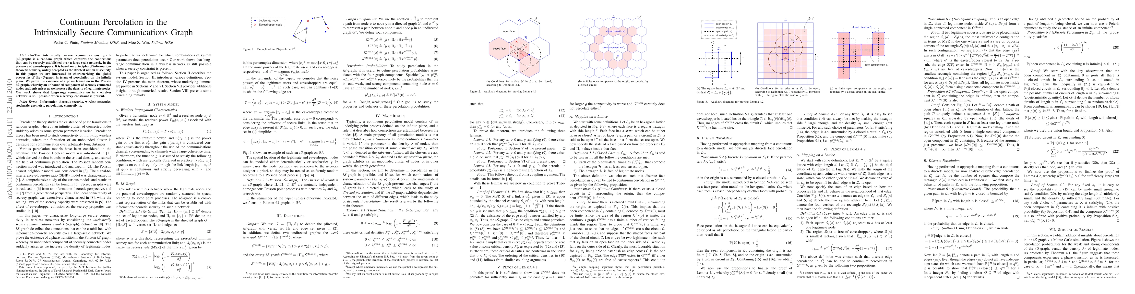 The intrinsically secure communications graph (iS-graph) is a random graph which captures the connections that can be securely established over a large-scale network, in the presence of eavesdroppers. It is based on principles of information-theoretic security, widely accepted as the strictest notion of security. In this paper, we are interested in characterizing the global properties of the iS-graph in terms of percolation on the infinite plane. We prove the existence of a phase transition in the Poisson iS-graph, whereby an unbounded component of securely connected nodes suddenly arises as we increase the density of legitimate nodes. Our work shows that long-range communication in a wireless network is still possible when a secrecy constraint is present.
