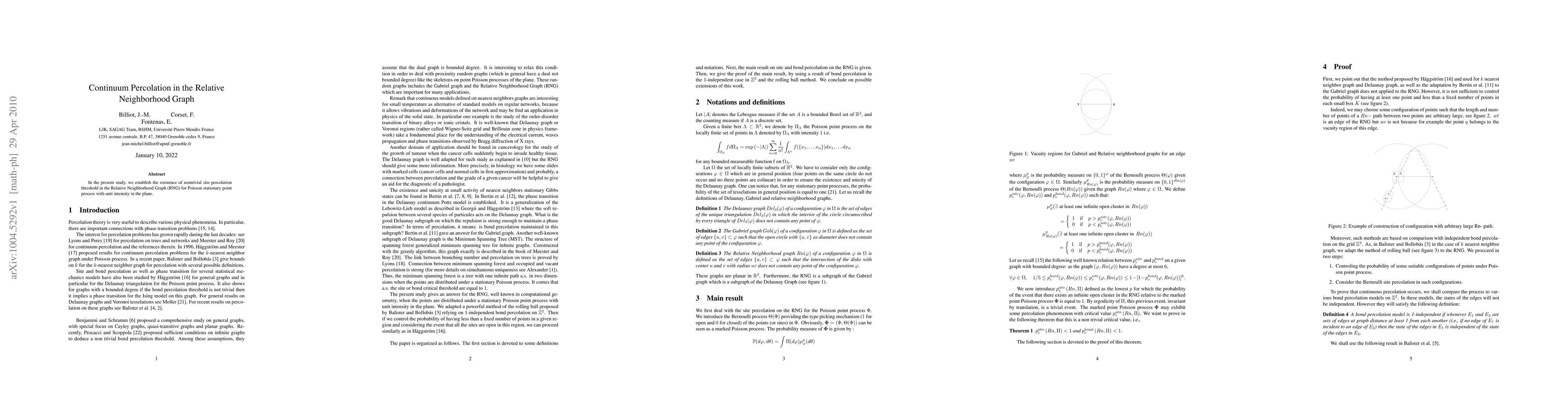 In the present study, we establish the existence of nontrivial site percolation threshold in the Relative Neighborhood Graph (RNG) for Poisson stationary point process with unit intensity in the plane.