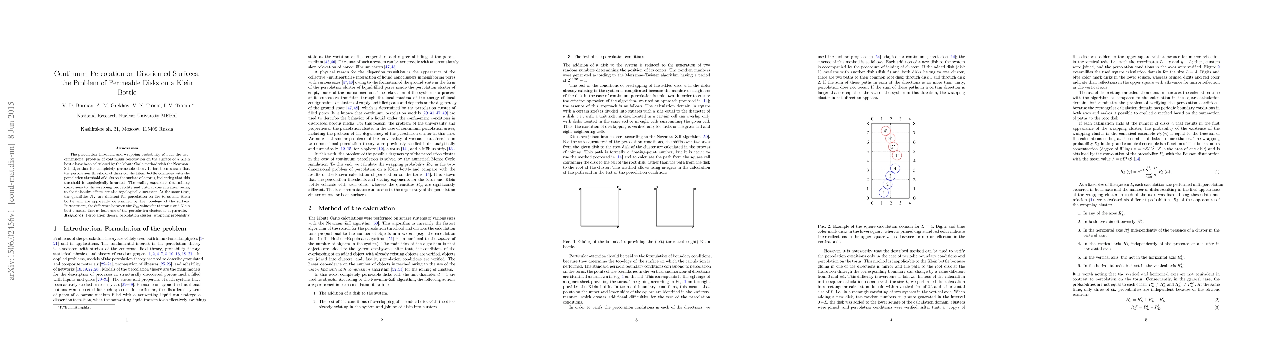 This paper calculates the percolation threshold and wrapping probability for permeable disks on a Klein bottle using Monte Carlo methods, finding that the percolation threshold is topologically invariant like that on a torus. However, the wrapping probability differs, indicating a degenerate percolation cluster and highlighting the influence of surface topology.