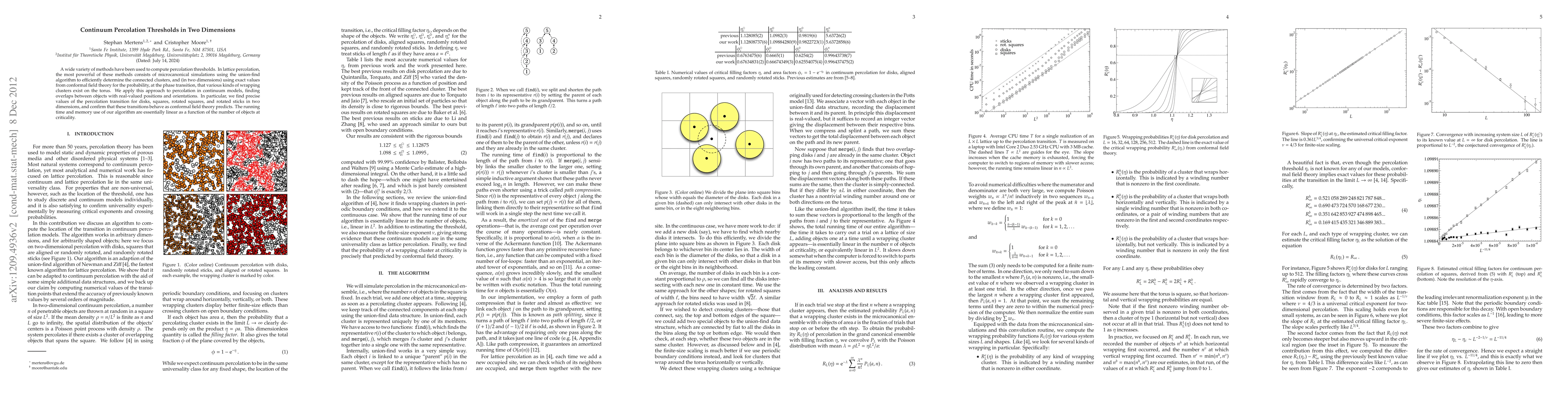 A wide variety of methods have been used to compute percolation thresholds. In lattice percolation, the most powerful of these methods consists of microcanonical simulations using the union-find algorithm to efficiently determine the connected clusters, and (in two dimensions) using exact values from conformal field theory for the probability, at the phase transition, that various kinds of wrapping clusters exist on the torus. We apply this approach to percolation in continuum models, finding overlaps between objects with real-valued positions and orientations. In particular, we find precise values of the percolation transition for disks, squares, rotated squares, and rotated sticks in two dimensions, and confirm that these transitions behave as conformal field theory predicts. The running time and memory use of our algorithm are essentially linear as a function of the number of objects at criticality.