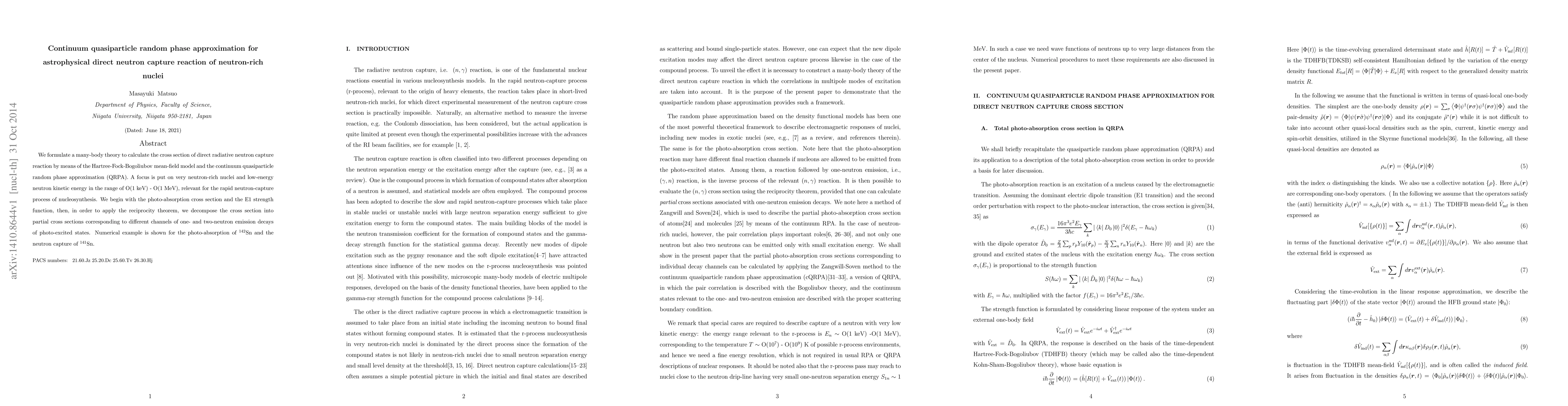 We formulate a many-body theory to calculate the cross section of direct radiative neutron capture reaction by means of the Hartree-Fock-Bogoliubov mean-field model and the continuum quasiparticle random phase approximation (QRPA). A focus is put on very neutron-rich nuclei and low-energy neutron kinetic energy in the range of O(1 keV) - O(1 MeV), relevant for the rapid neutron-capture process of nucleosynthesis. We begin with the photo-absorption cross section and the E1 strength function, then, in order to apply the reciprocity theorem, we decompose the cross section into partial cross sections corresponding to different channels of one- and two-neutron emission decays of photo-excited states. Numerical example is shown for the photo-absorption of $^{142}$Sn and the neutron capture of $^{141}$Sn.