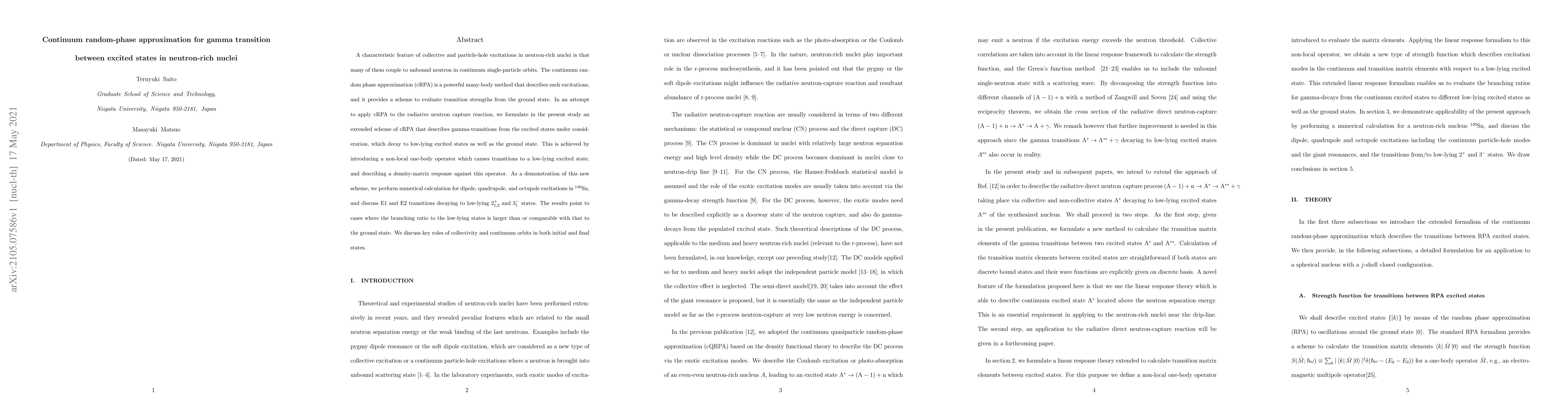 This paper develops an extended continuum random phase approximation (cRPA) to describe gamma-transitions in neutron-rich nuclei, introducing a non-local operator to evaluate transitions to low-lying states. Numerical calculations for $^{140}$Sn show significant branching ratios to low-lying excited states, highlighting the importance of collectivity and continuum effects.