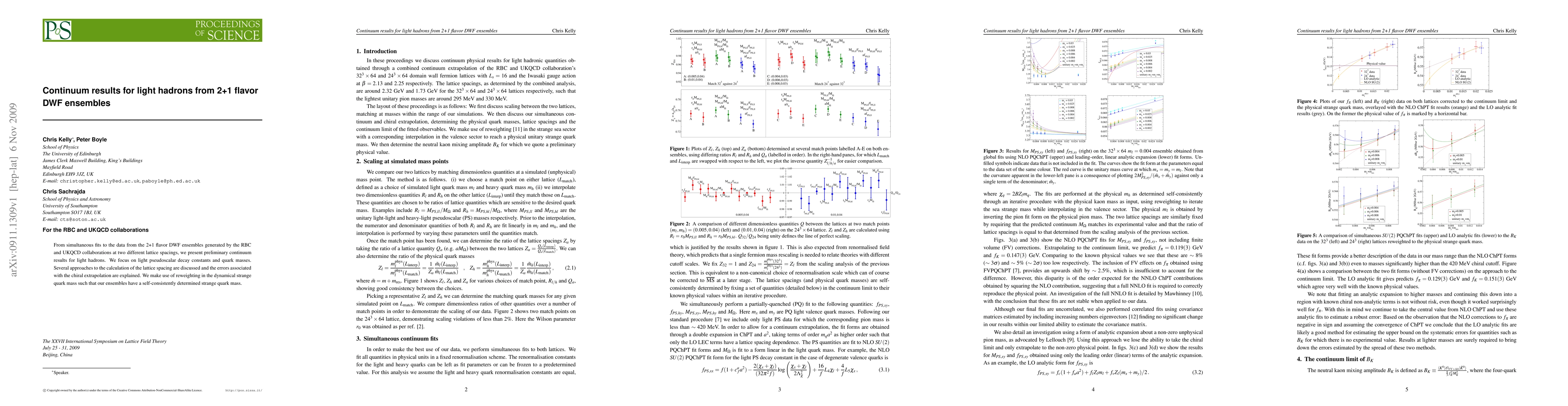 From simultaneous fits to the data from the 2+1 flavor DWF ensembles generated by the RBC and UKQCD collaborations at two different lattice spacings, we present preliminary continuum results for light hadrons. We focus on light pseudoscalar decay constants and quark masses. Several approaches to the calculation of the lattice spacing are discussed and the errors associated with the chiral extrapolation are explained. We make use of reweighting in the dynamical strange quark mass such that our ensembles have a self-consistently determined strange quark mass.