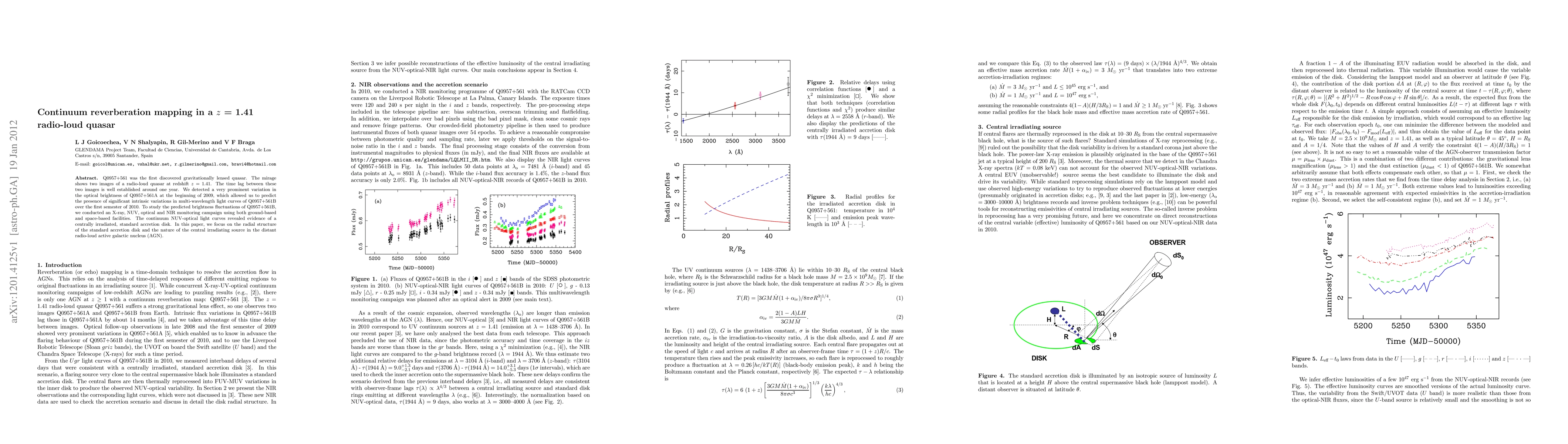 This paper investigates the radial structure of the accretion disk and the central irradiating source in the radio-loud quasar Q0957+561 using continuum reverberation mapping. The study reveals evidence of a standard accretion disk and intrinsic variations in the quasar's multi-wavelength light curves.
