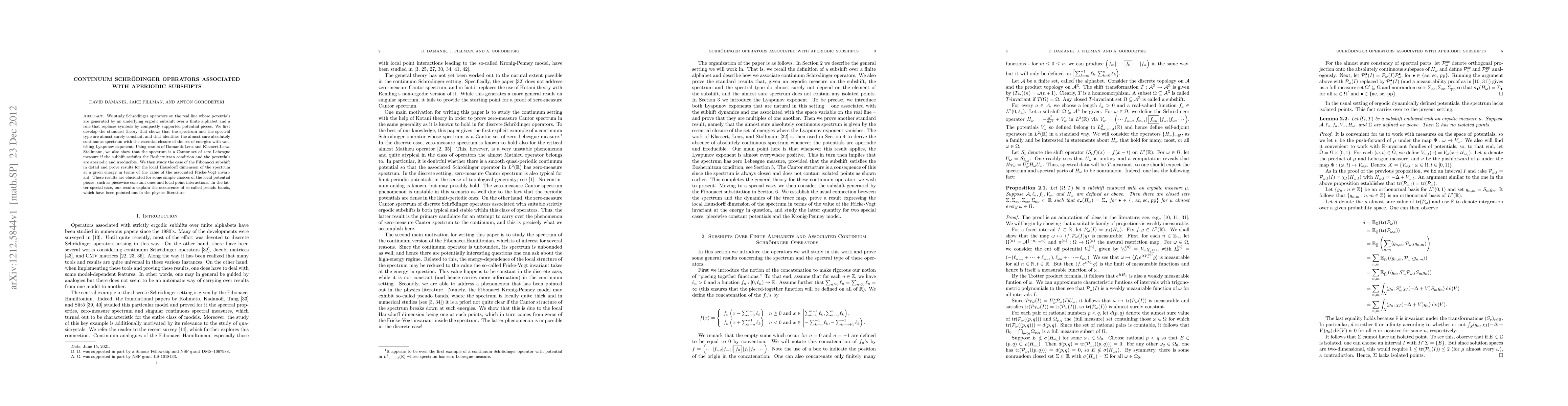 This paper investigates continuum Schrödinger operators with potentials generated by aperiodic subshifts. It establishes almost sure constancy of spectrum and spectral type, identifies the absolutely continuous spectrum, and demonstrates that the spectrum forms a Cantor set under certain conditions. Detailed analysis of the Fibonacci subshift reveals local Hausdorff dimension results linked to the Fricke-Vogt invariant, explaining pseudo bands in specific potential configurations.