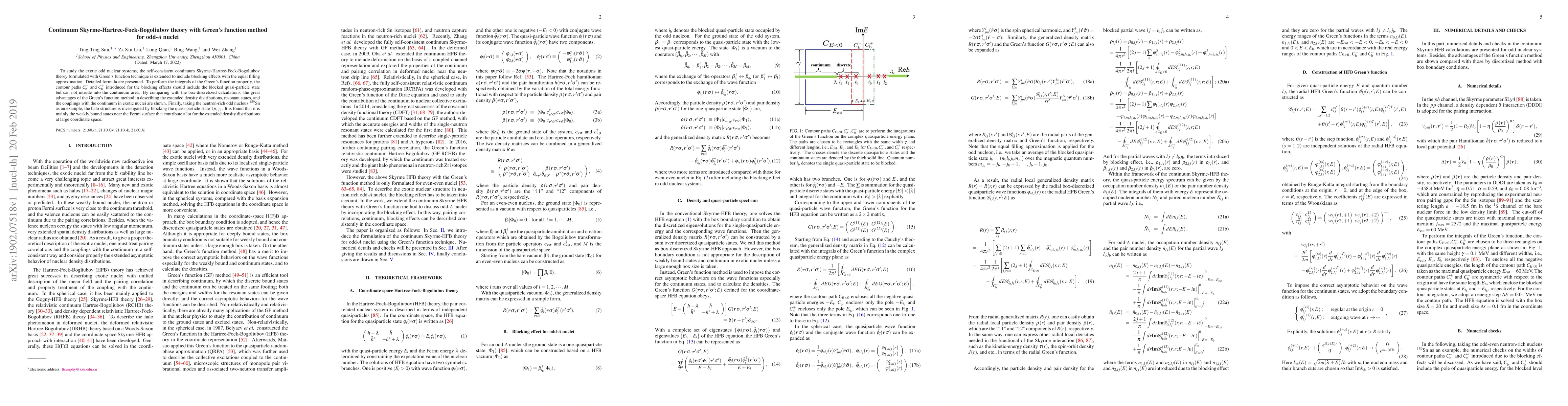 This paper extends the continuum Skyrme-Hartree-Fock-Bogoliubov theory using Green's function method to study odd-$A$ nuclei, focusing on blocking effects and the equal filling approximation. The method is shown to better describe extended density distributions and resonant states in exotic nuclei, exemplified by the neutron-rich $^{159}$Sn, where weakly bound states near the Fermi surface contribute to halo structure.