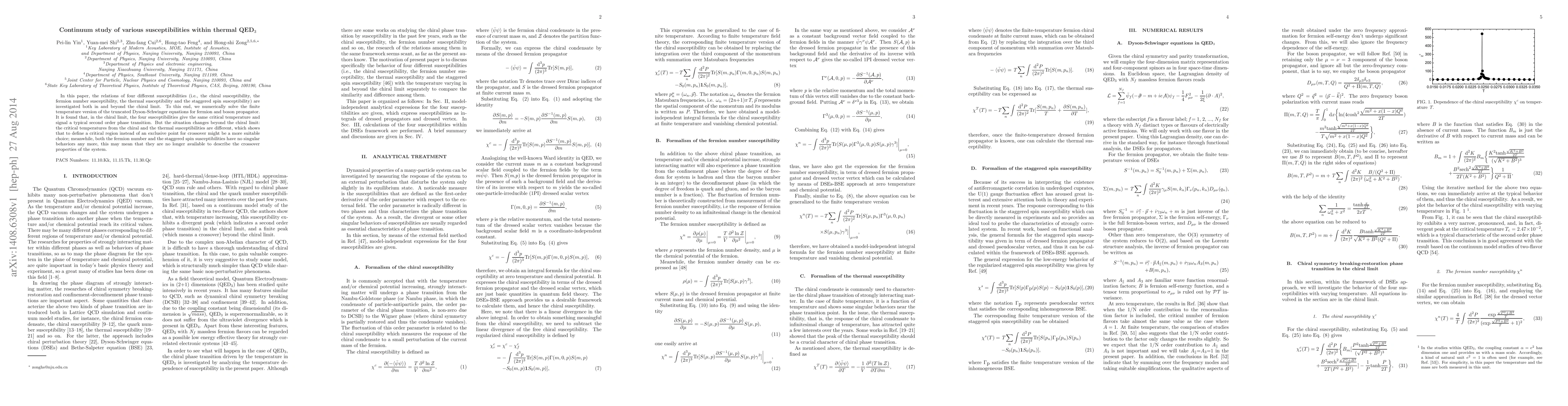 In this paper, the relations of four different susceptibilities (i.e., the chiral susceptibility, the fermion number susceptibility, the thermal susceptibility and the staggered spin susceptibility) are investigated both in and beyond the chiral limit. To this end, we numerically solve the finite temperature version of the truncated Dyson-Schwinger equations for fermion and boson propagator. It is found that, in the chiral limit, the four susceptibilities give the same critical temperature and signal a typical second order phase transition. But the situation changes beyond the chiral limit: the critical temperatures from the chiral and the thermal susceptibilities are different, which shows that to define a critical region instead of an exclusive point for crossover might be a more suitable choice; meanwhile, both the fermion number and the staggered spin susceptibilities have no singular behaviors any more, this may mean that they are no longer available to describe the crossover properties of the system.