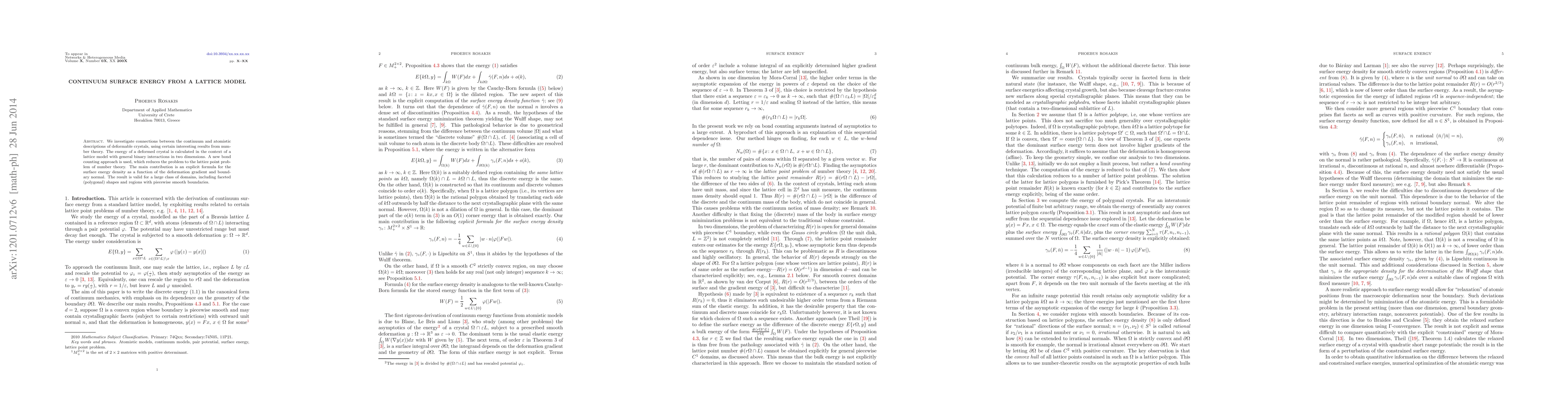 We investigate connections between the continuum and atomistic descriptions of deformable crystals, using certain interesting results from number theory. The energy of a deformed crystal is calculated in the context of a lattice model with general binary interactions in two dimensions. A new bond counting approach is used, which reduces the problem to the lattice point problem of number theory. The main contribution is an explicit formula for the surface energy density as a function of the deformation gradient and boundary normal. The result is valid for a large class of domains, including faceted (polygonal) shapes and regions with piecewise smooth boundaries.