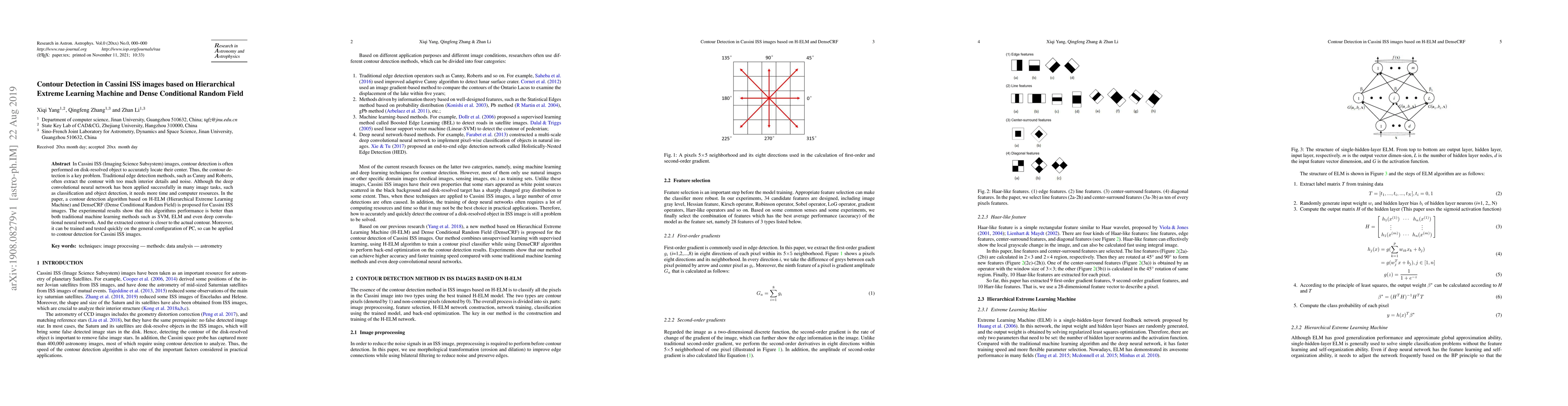 This paper proposes a contour detection algorithm for Cassini ISS images using H-ELM and DenseCRF, which outperforms traditional methods and deep learning networks in accuracy and efficiency. The method is fast and effective on standard PC configurations.