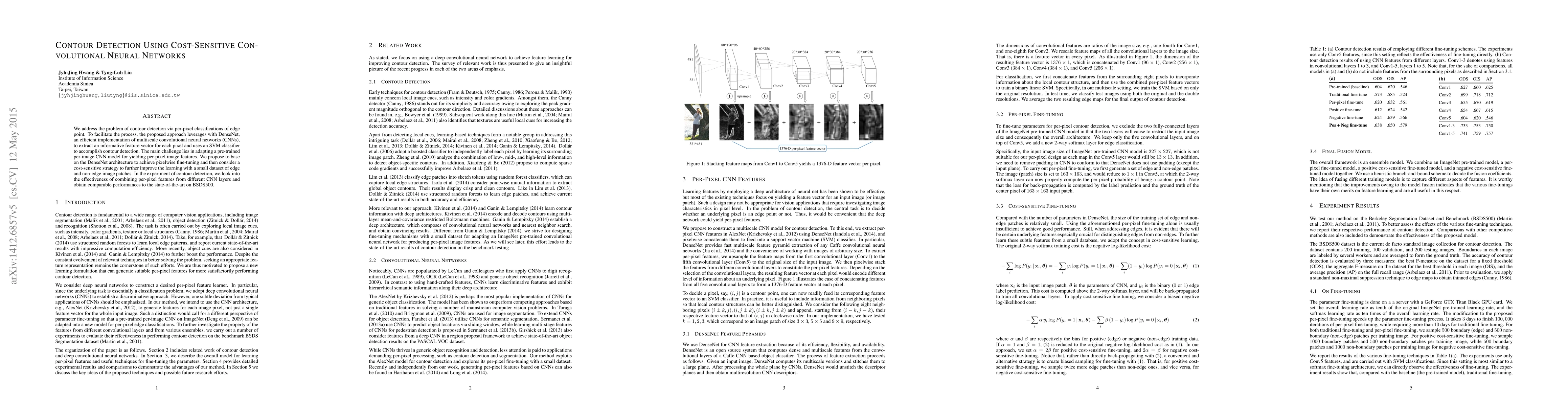 This paper proposes a contour detection method using DenseNet for feature extraction and a cost-sensitive strategy to improve learning with limited data. It combines per-pixel features from different CNN layers and achieves competitive results on the BSDS500 dataset.
