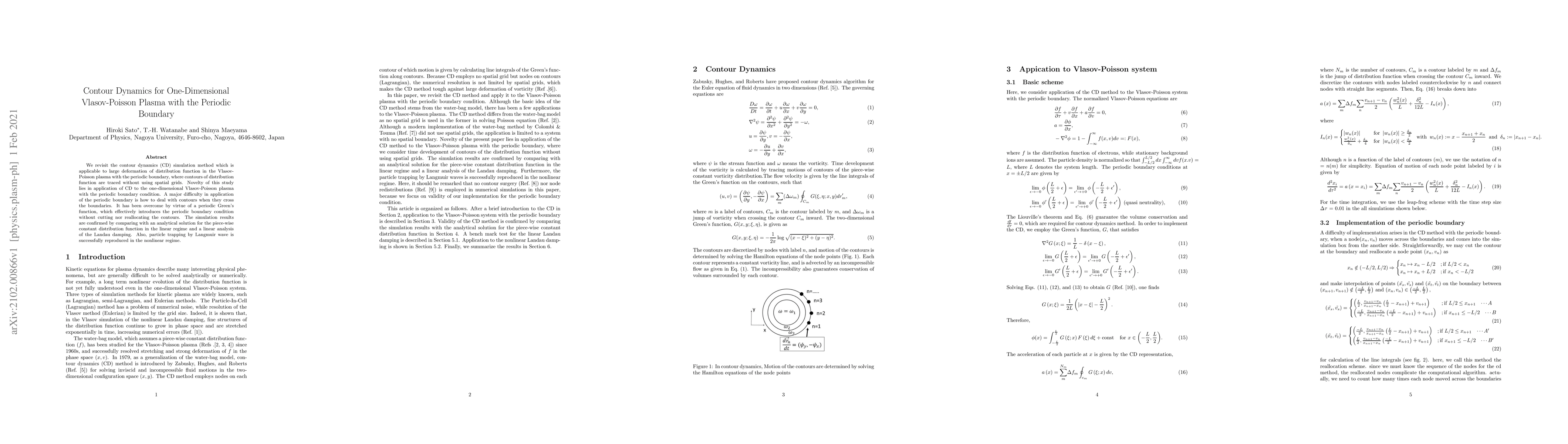We revisit the contour dynamics (CD) simulation method which is applicable to large deformation of distribution function in the Vlasov-Poisson plasma with the periodic boundary, where contours of distribution function are traced without using spatial grids. Novelty of this study lies in application of CD to the one-dimensional Vlasov-Poisson plasma with the periodic boundary condition. A major difficulty in application of the periodic boundary is how to deal with contours when they cross the boundaries. It has been overcome by virtue of a periodic Green's function, which effectively introduces the periodic boundary condition without cutting nor reallocating the contours. The simulation results are confirmed by comparing with an analytical solution for the piece-wise constant distribution function in the linear regime and a linear analysis of the Landau damping. Also, particle trapping by Langmuir wave is successfully reproduced in the nonlinear regime.
