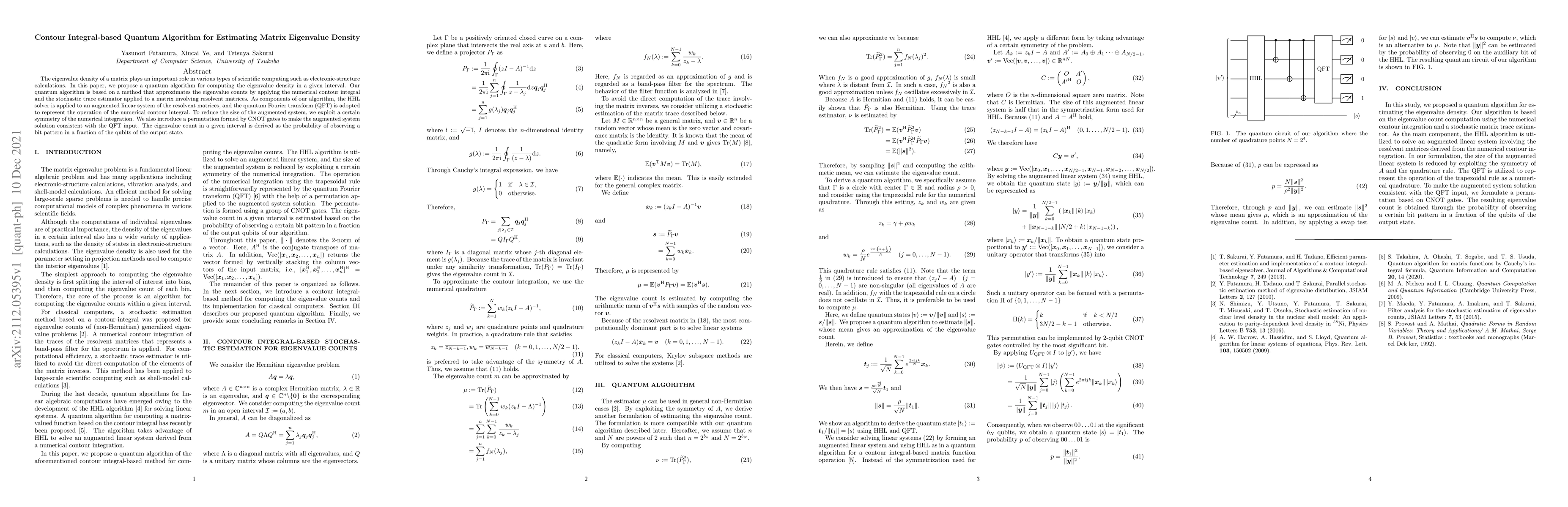 This paper proposes a quantum algorithm to estimate the eigenvalue density of a matrix using a contour integral method and the HHL solver. It employs the quantum Fourier transform to represent the integral and reduces the system size through symmetry and CNOT gate permutations, ultimately deriving eigenvalue counts from qubit output patterns.