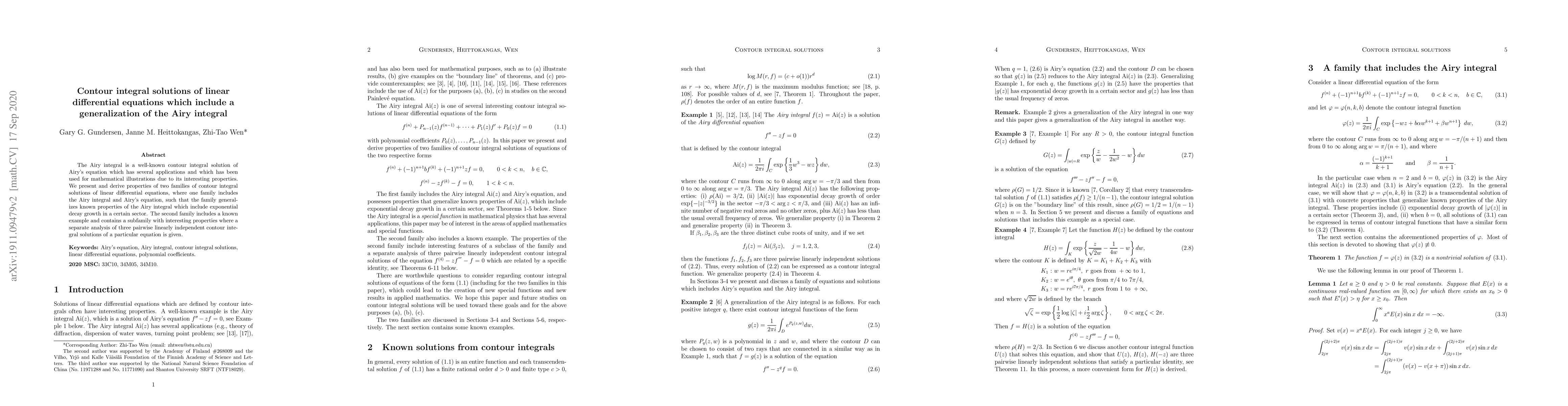 This paper derives two families of contour integral solutions for linear differential equations, generalizing the Airy integral. One family includes the Airy integral and extends its exponential decay properties, while the second family features a known example with a detailed analysis of three independent solutions.
