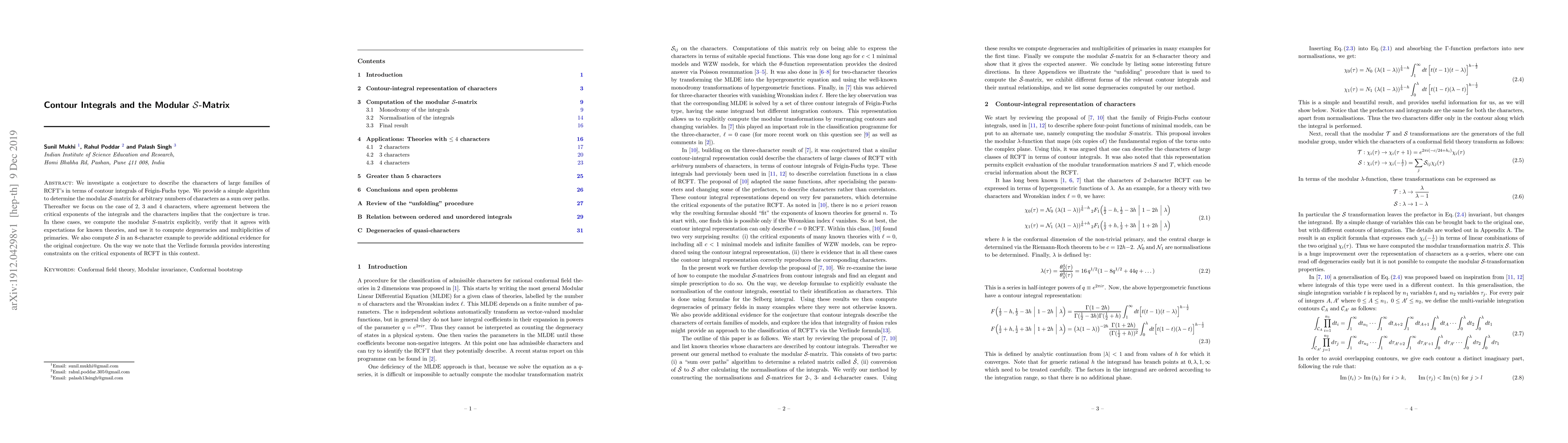 We investigate a conjecture to describe the characters of large families of RCFT's in terms of contour integrals of Feigin-Fuchs type. We provide a simple algorithm to determine the modular S-matrix for arbitrary numbers of characters as a sum over paths. Thereafter we focus on the case of 2, 3 and 4 characters, where agreement between the critical exponents of the integrals and the characters implies that the conjecture is true. In these cases, we compute the modular S-matrix explicitly, verify that it agrees with expectations for known theories, and use it to compute degeneracies and multiplicities of primaries. We also compute S in an 8-character example to provide additional evidence for the original conjecture. On the way we note that the Verlinde formula provides interesting constraints on the critical exponents of RCFT in this context.