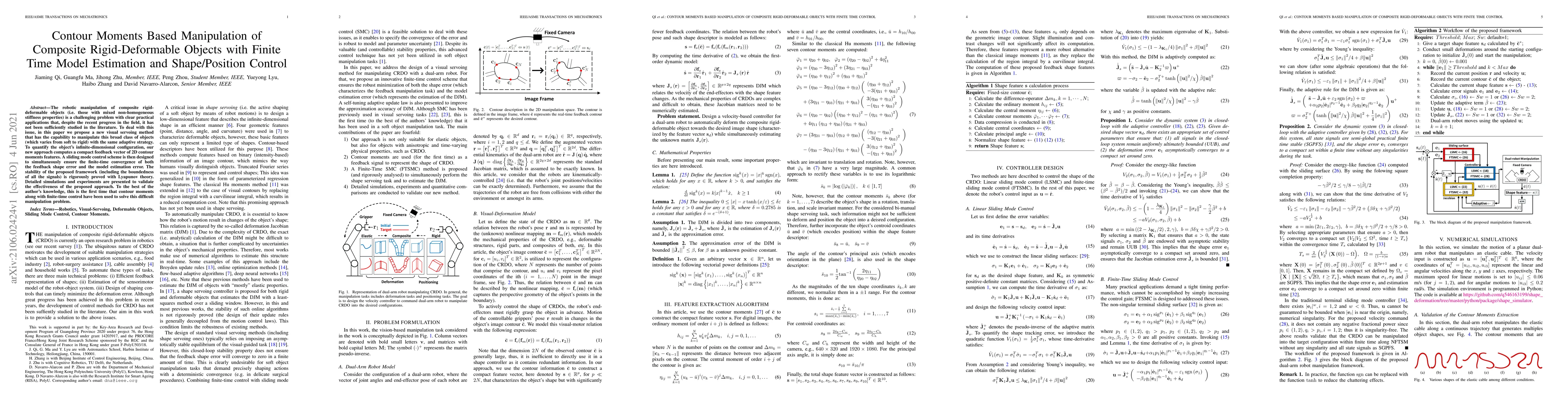 This paper proposes a novel visual servoing method for manipulating composite rigid-deformable objects using contour moments and finite-time control. The approach ensures finite-time convergence and stability, validated through rigorous simulations and experiments.