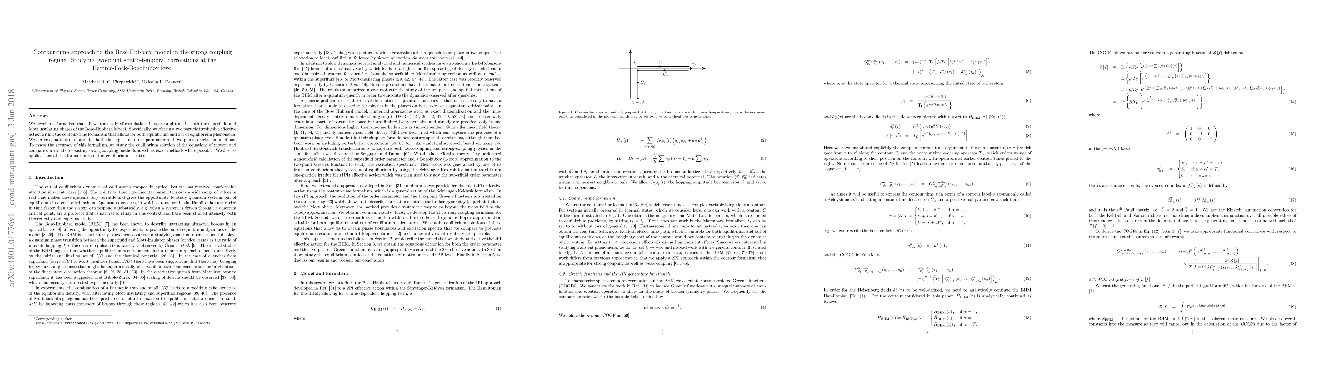 This paper develops a contour-time formalism to study spatial and temporal correlations in the Bose-Hubbard model, deriving equations of motion for the superfluid order parameter and two-point correlation functions. It compares the equilibrium results to strong coupling and exact methods, highlighting applications to out-of-equilibrium phenomena.