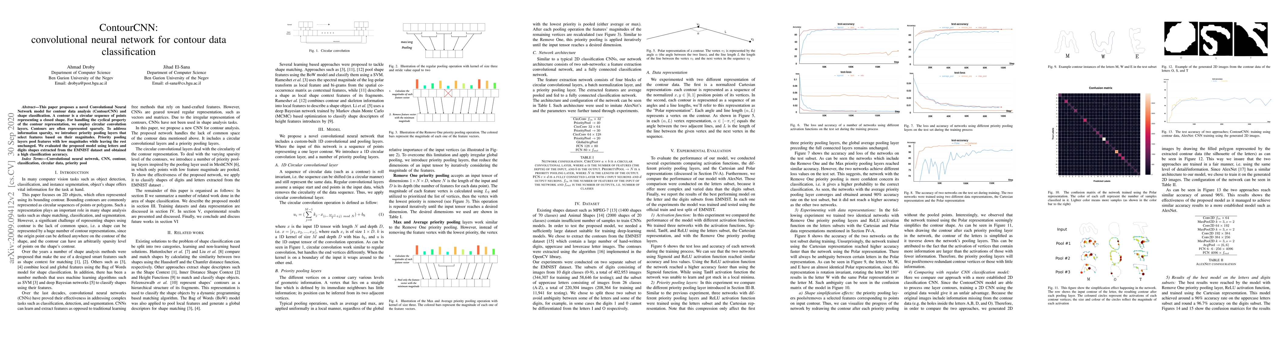This paper proposes a novel Convolutional Neural Network model for contour data analysis (ContourCNN) and shape classification. A contour is a circular sequence of points representing a closed shape. For handling the cyclical property of the contour representation, we employ circular convolution layers. Contours are often represented sparsely. To address information sparsity, we introduce priority pooling layers that select features based on their magnitudes. Priority pooling layers pool features with low magnitudes while leaving the rest unchanged. We evaluated the proposed model using letters and digits shapes extracted from the EMNIST dataset and obtained a high classification accuracy.