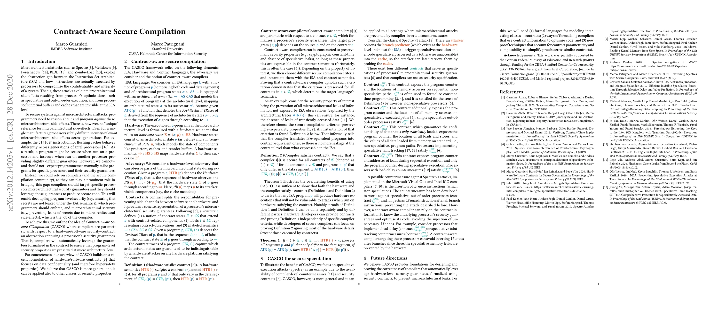 Microarchitectural attacks exploit the abstraction gap between the Instruction Set Architecture (ISA) and how instructions are actually executed by processors to compromise the confidentiality and integrity of a system. To secure systems against microarchitectural attacks, programmers need to reason about and program against these microarchitectural side-effects. However, we cannot -- and should not -- expect programmers to manually tailor programs for specific processors and their security guarantees. Instead, we could rely on compilers (and the secure compilation community), as they can play a prominent role in bridging this gap: compilers should target specific processors microarchitectural security guarantees and they should leverage these guarantees to produce secure code. To achieve this, we outline the idea of Contract-Aware Secure COmpilation (CASCO) where compilers are parametric with respect to a hardware/software security-contract, an abstraction capturing a processor's security guarantees. That is, compilers will automatically leverage the guarantees formalized in the contract to ensure that program-level security properties are preserved at microarchitectural level.