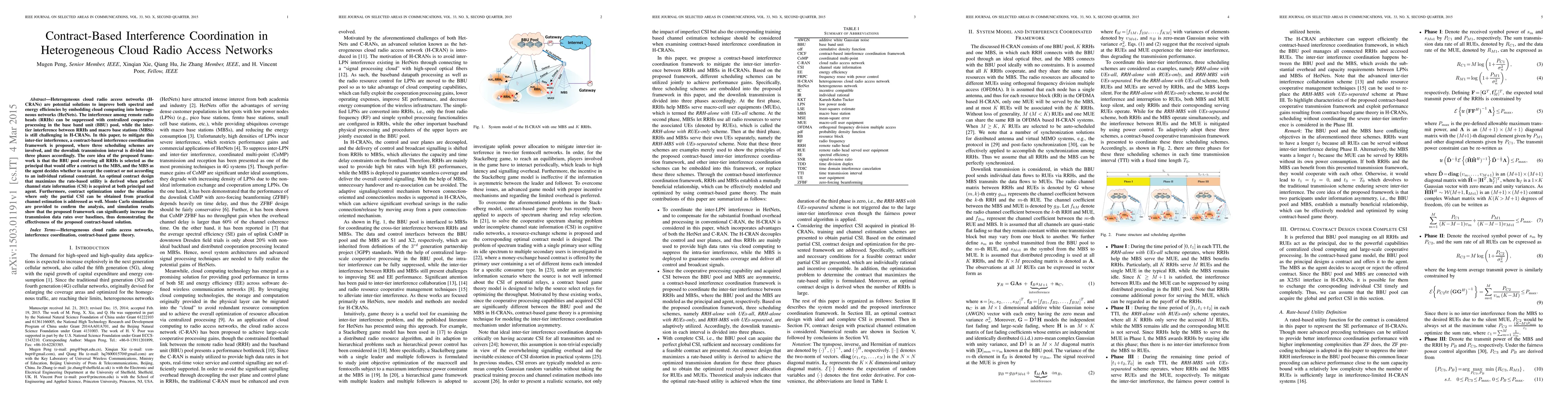 This paper proposes a contract-based interference coordination framework for heterogeneous cloud radio access networks (HCRANs) to mitigate inter-tier interference between remote radio heads (RRHs) and macro base stations (MBSs). The framework involves three scheduling schemes and an optimal contract design to maximize rate-based utility, validated through Monte Carlo simulations showing significant improvements in data rates.