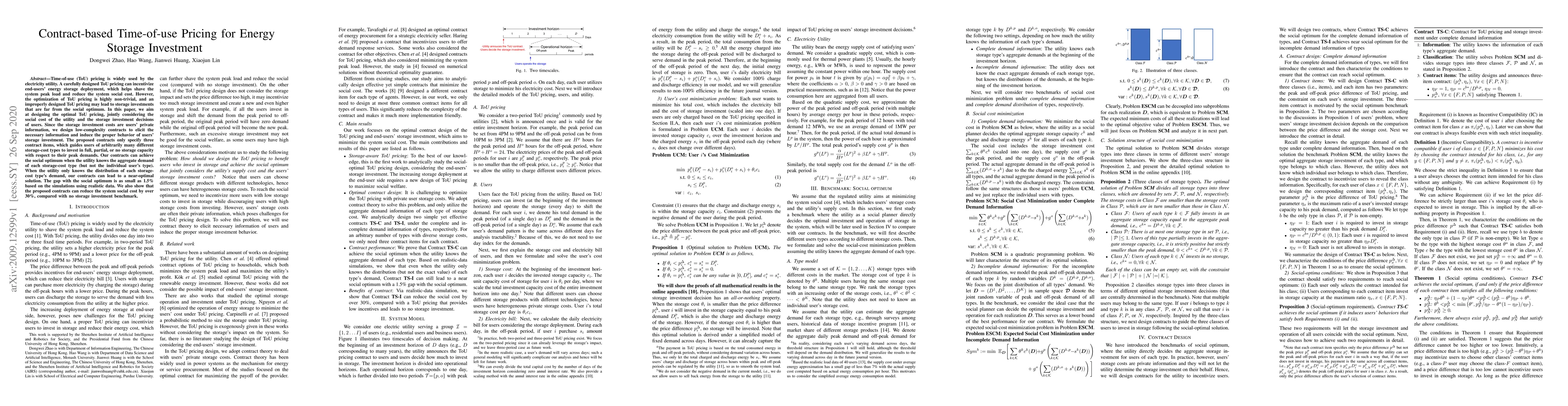 This paper proposes optimal contract-based time-of-use pricing to incentivize energy storage investment, aiming to reduce system peak load and social cost. The designed contracts, requiring minimal information from users, achieve near-optimal solutions and reduce system social cost by over 30%.