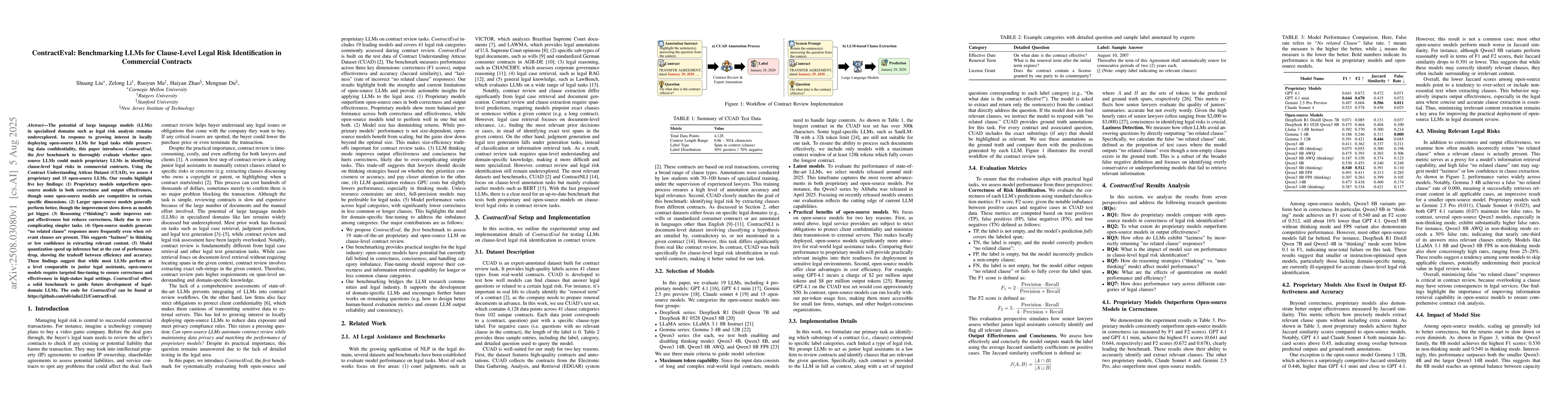 The potential of large language models (LLMs) in specialized domains such as legal risk analysis remains underexplored. In response to growing interest in locally deploying open-source LLMs for legal tasks while preserving data confidentiality, this paper introduces ContractEval, the first benchmark to thoroughly evaluate whether open-source LLMs could match proprietary LLMs in identifying clause-level legal risks in commercial contracts. Using the Contract Understanding Atticus Dataset (CUAD), we assess 4 proprietary and 15 open-source LLMs. Our results highlight five key findings: (1) Proprietary models outperform open-source models in both correctness and output effectiveness, though some open-source models are competitive in certain specific dimensions. (2) Larger open-source models generally perform better, though the improvement slows down as models get bigger. (3) Reasoning ("thinking") mode improves output effectiveness but reduces correctness, likely due to over-complicating simpler tasks. (4) Open-source models generate "no related clause" responses more frequently even when relevant clauses are present. This suggests "laziness" in thinking or low confidence in extracting relevant content. (5) Model quantization speeds up inference but at the cost of performance drop, showing the tradeoff between efficiency and accuracy. These findings suggest that while most LLMs perform at a level comparable to junior legal assistants, open-source models require targeted fine-tuning to ensure correctness and effectiveness in high-stakes legal settings. ContractEval offers a solid benchmark to guide future development of legal-domain LLMs.