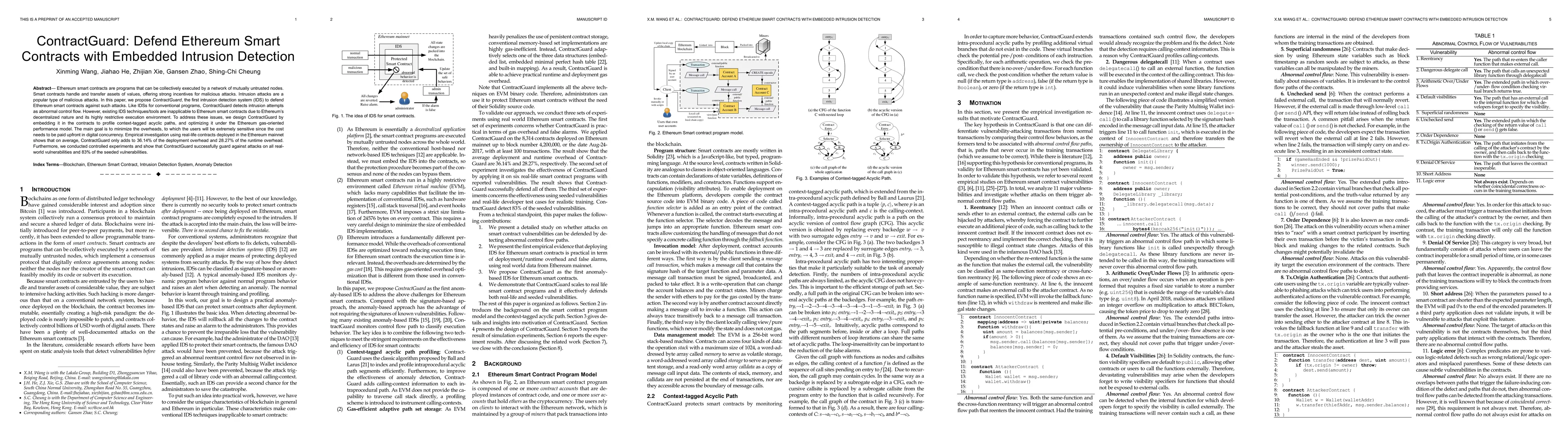 ContractGuard is an intrusion detection system designed to defend Ethereum smart contracts by embedding it within the contracts to detect abnormal control flows. It successfully guards against real-world and seeded vulnerabilities with minimal overhead, adding only 36.14% to deployment and 28.27% to runtime costs.