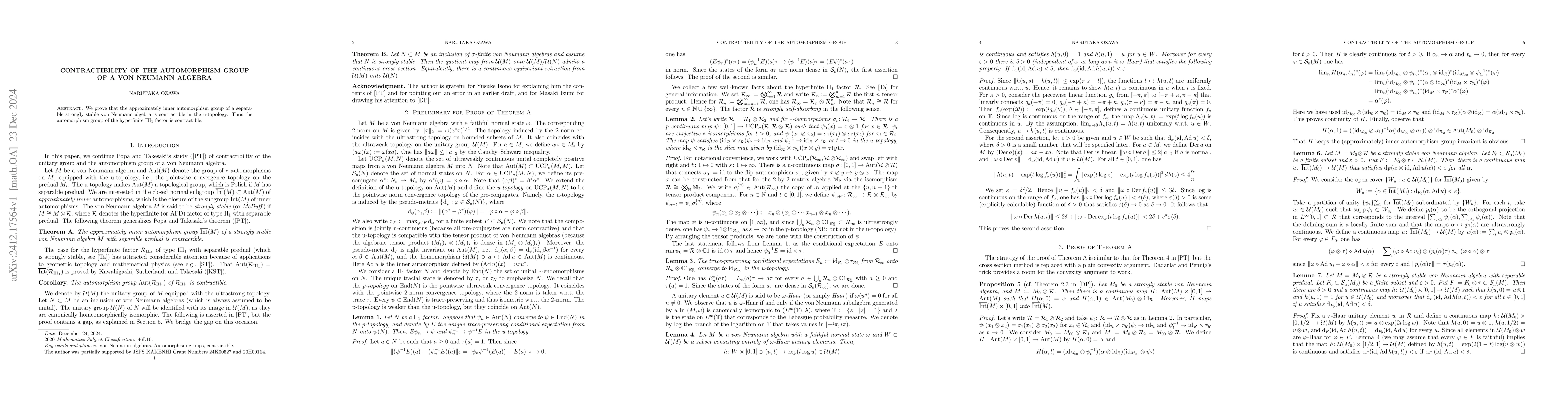 Summary: The research demonstrates that the approximately inner automorphism group of a separable, strongly stable von Neumann algebra is contractible in the u-topology, with a specific application to the automorphism group of the hyperfinite III₁ factor.