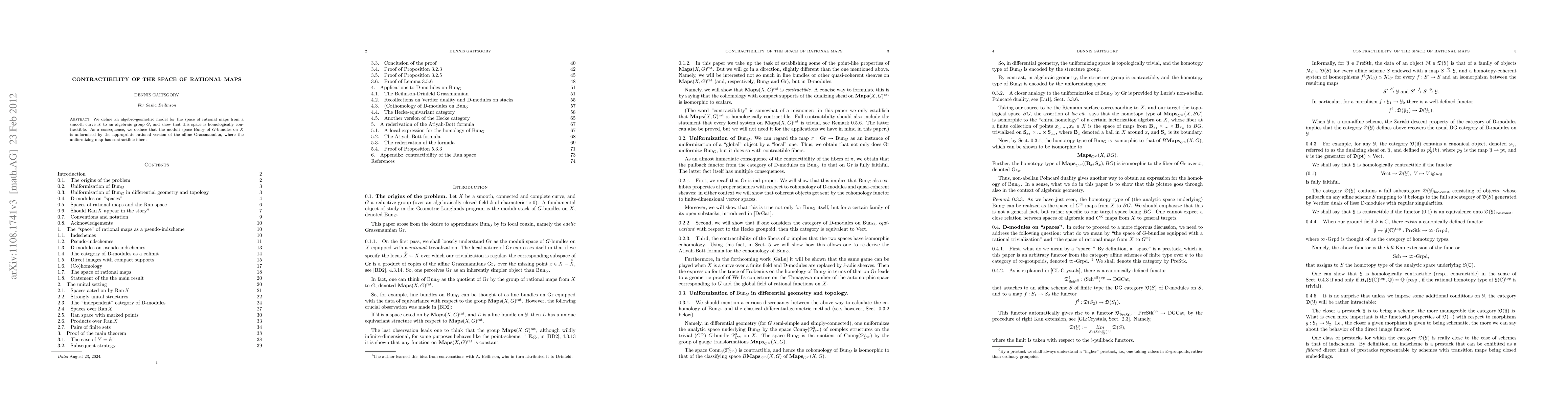 This paper constructs an algebro-geometric model for rational maps from a smooth curve to an algebraic group, proving the space is homologically contractible. Consequently, it shows that the moduli space of G-bundles on the curve is uniformized by a rational version of the affine Grassmannian with contractible fibers.
