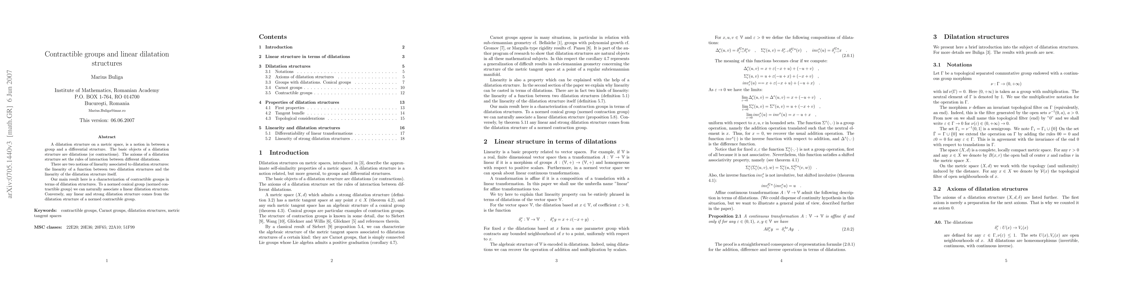 This paper explores the relationship between contractible groups and linear dilatation structures, showing that contractible groups can be characterized through associated linear dilatation structures. It distinguishes between the linearity of functions between dilatation structures and the inherent linearity of the structures themselves.