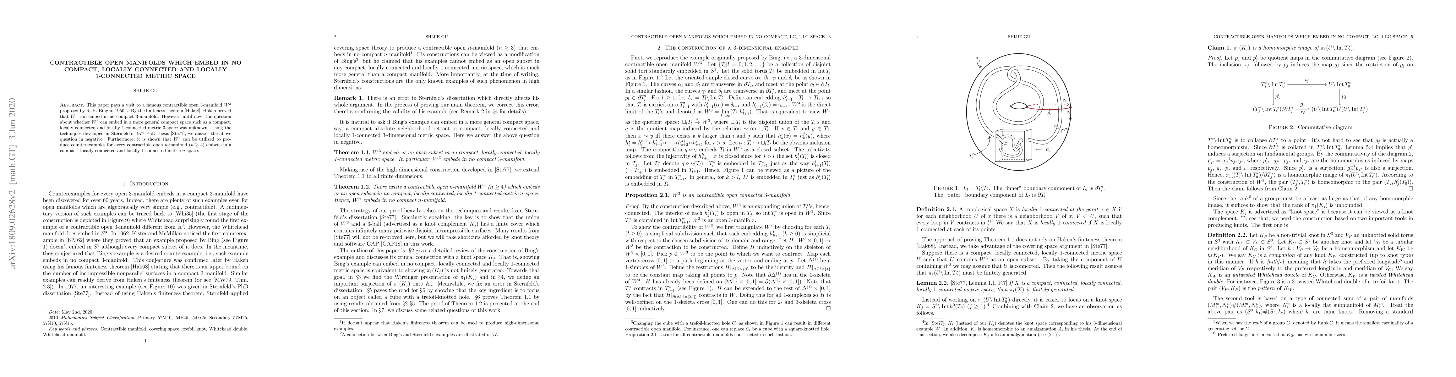 This paper pays a visit to a famous contractible open 3-manifold $W^3$ proposed by R. H. Bing in 1950's. By the finiteness theorem \cite{Hak68}, Haken proved that $W^3$ can embed in no compact 3-manifold. However, until now, the question about whether $W^3$ can embed in a more general compact space such as a compact, locally connected and locally 1-connected metric 3-space was not known. Using the techniques developed in Sternfeld's 1977 PhD thesis \cite{Ste77}, we answer the above question in negative. Furthermore, it is shown that $W^3$ can be utilized to produce counterexamples for every contractible open $n$-manifold ($n\geq 4$) embeds in a compact, locally connected and locally 1-connected metric $n$-space.