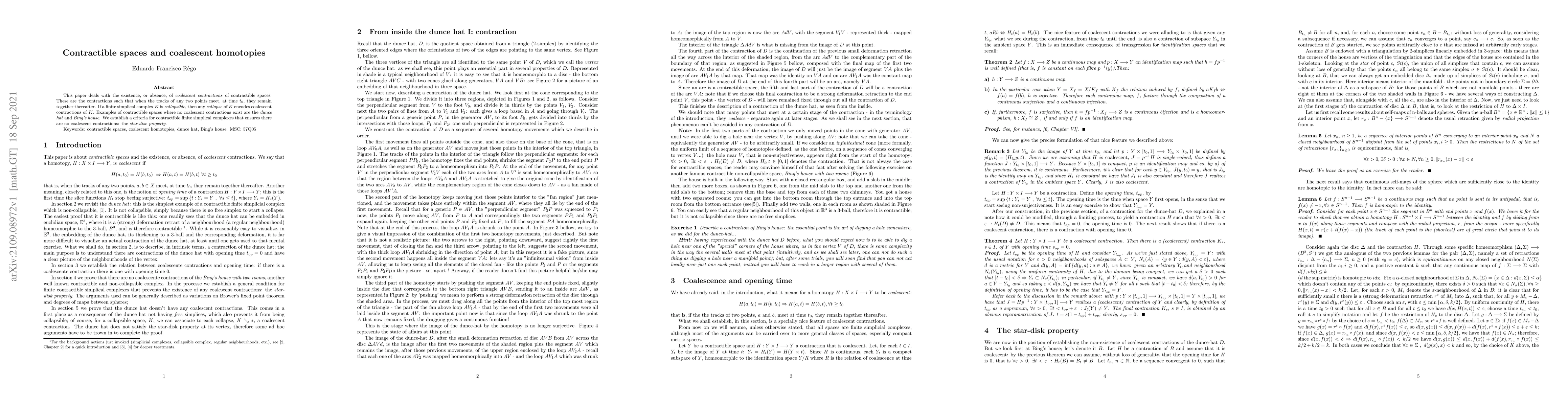 This paper investigates coalescent contractions in contractible spaces, showing that collapsible finite simplicial complexes encode such contractions. It highlights examples like the Dunce Hat and Bing's house where no coalescent contractions exist, and introduces the star-disc property as a criterion for the absence of these contractions.