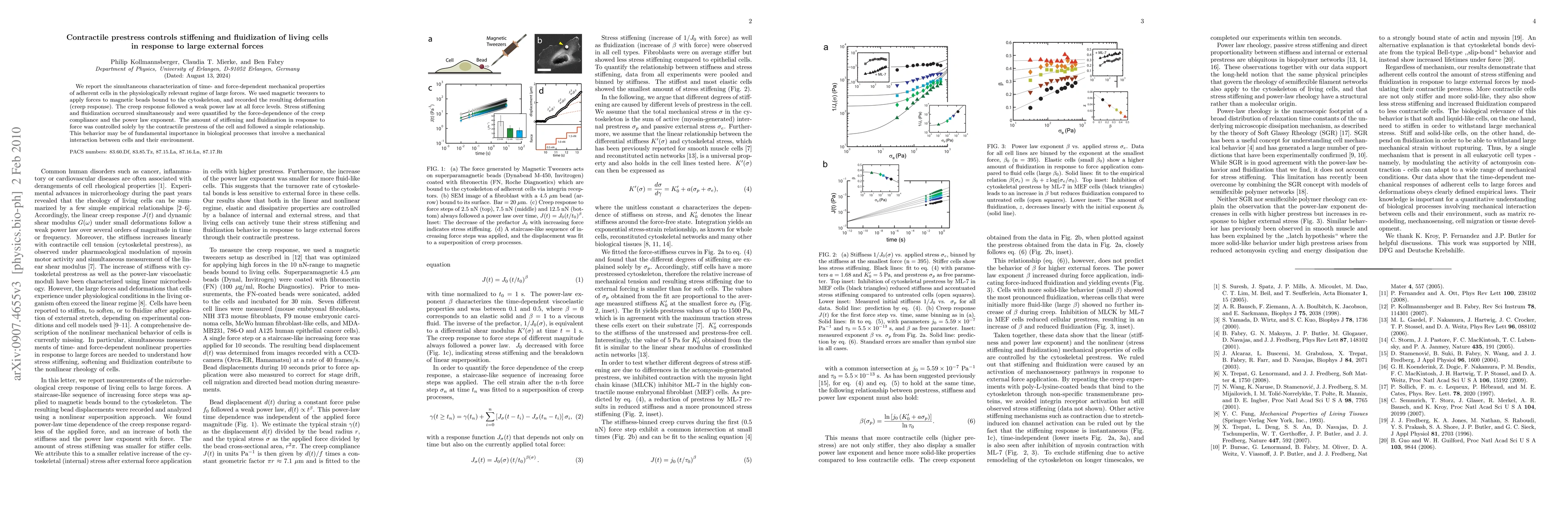 This study investigates how contractile prestress in living cells influences their mechanical response to large external forces, revealing that both stiffening and fluidization behaviors are governed by this prestress, with implications for biological interactions involving mechanical forces.