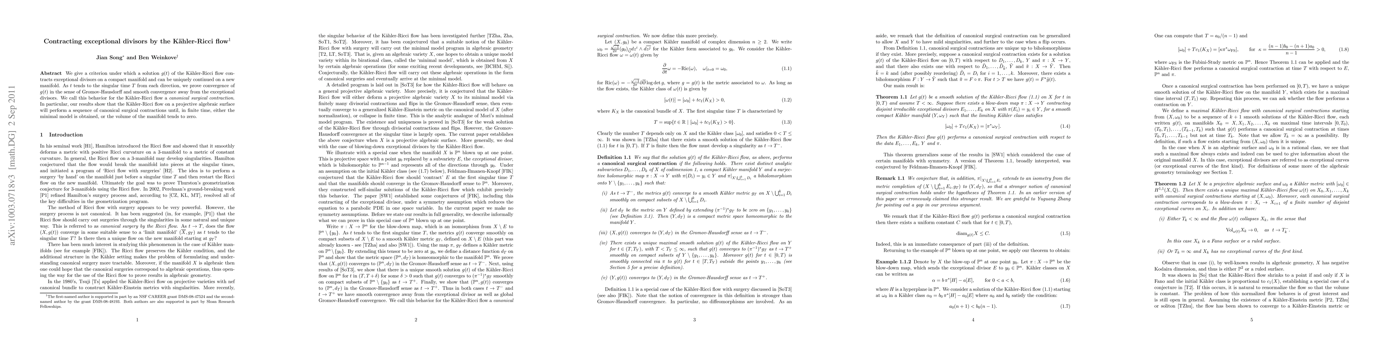 We give a criterion under which a solution g(t) of the Kahler-Ricci flow contracts exceptional divisors on a compact manifold and can be uniquely continued on a new manifold. As t tends to the singular time T from each direction, we prove convergence of g(t) in the sense of Gromov-Hausdorff and smooth convergence away from the exceptional divisors. We call this behavior for the Kahler-Ricci flow a canonical surgical contraction. In particular, our results show that the Kahler-Ricci flow on a projective algebraic surface will perform a sequence of canonical surgical contractions until, in finite time, either the minimal model is obtained, or the volume of the manifold tends to zero.
