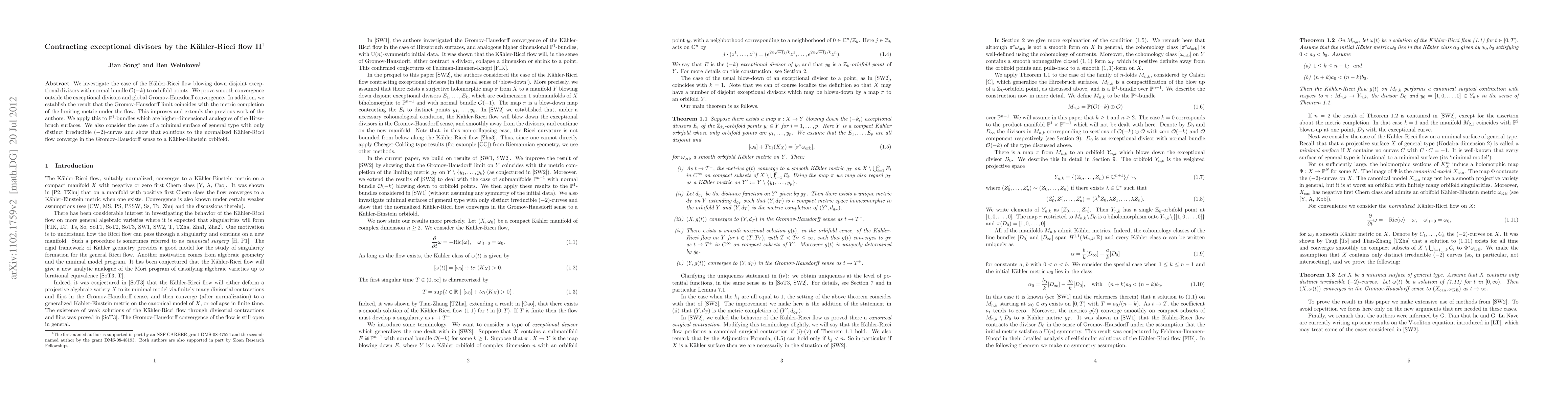 Researchers investigate the Kahler-Ricci flow's behavior on exceptional divisors and establish global Gromov-Hausdorff convergence, improving previous work and applying it to higher-dimensional surfaces and minimal surfaces with specific curve configurations.