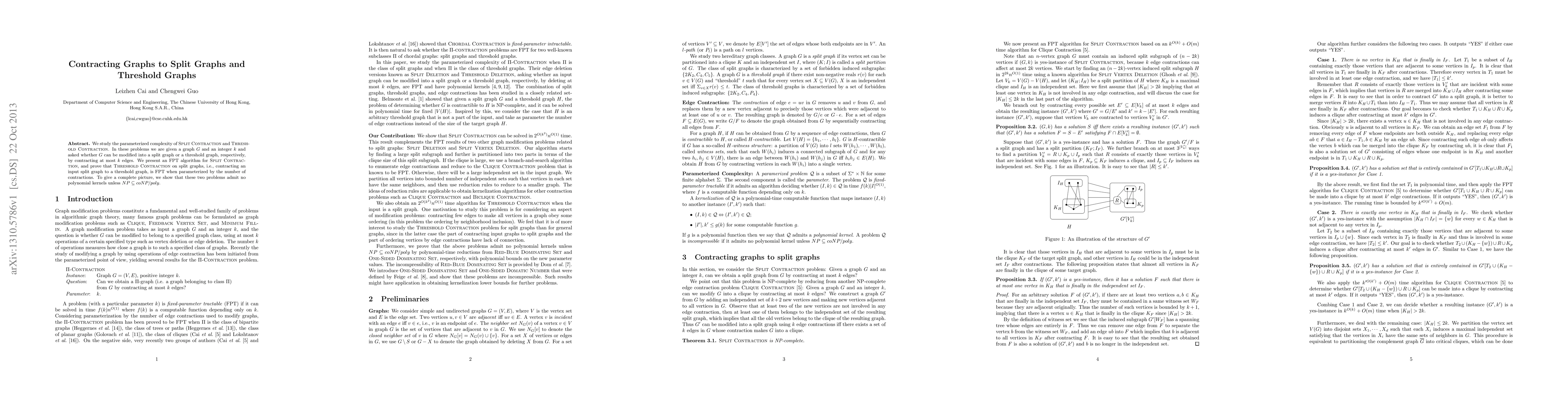 We study the parameterized complexity of Split Contraction and Threshold Contraction. In these problems we are given a graph G and an integer k and asked whether G can be modified into a split graph or a threshold graph, respectively, by contracting at most k edges. We present an FPT algorithm for Split Contraction, and prove that Threshold Contraction on split graphs, i.e., contracting an input split graph to a threshold graph, is FPT when parameterized by the number of contractions. To give a complete picture, we show that these two problems admit no polynomial kernels unless NP\subseteq coNP/poly.