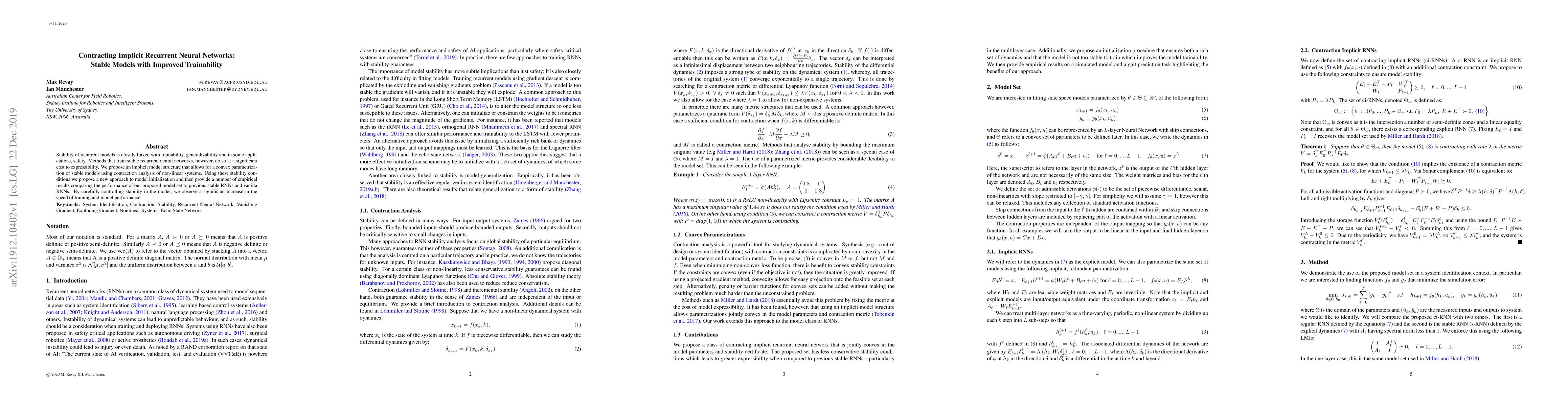 This paper proposes an implicit recurrent neural network structure that leverages contraction analysis for stable model training, achieving improved trainability and performance compared to traditional stable RNNs and vanilla RNNs. The method introduces a convex parametrization and enhanced model initialization, resulting in faster training and better overall results.