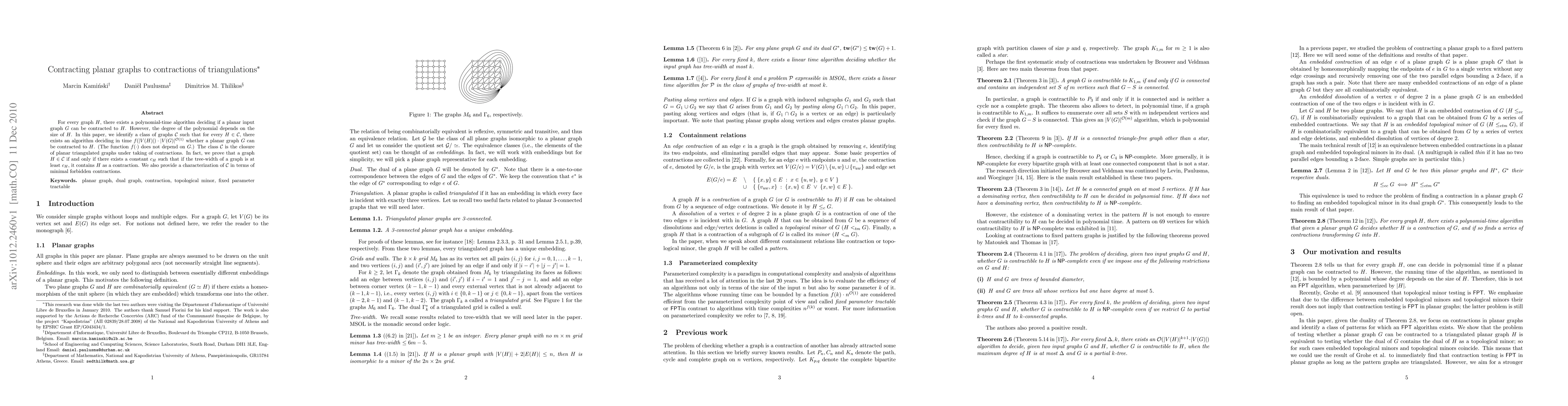 For every graph $H$, there exists a polynomial-time algorithm deciding if a planar input graph $G$ can be contracted to~$H$. However, the degree of the polynomial depends on the size of $H$. In this paper, we identify a class of graphs $\cal C$ such that for every $H \in \cal C$, there exists an algorithm deciding in time $f(|V(H)|) \cdot |V(G)|^{\bigO{1}}$ whether a planar graph $G$ can be contracted to~$H$. (The function $f(\cdot)$ does not depend on $G$.) The class $\cal C$ is the closure of planar triangulated graphs under taking of contractions. In fact, we prove that a graph $H \in \cal C$ if and only if there exists a constant $c_H$ such that if the tree-width of a graph is at least $c_H$, it contains $H$ as a contraction. We also provide a characterization of $\cal C$ in terms of minimal forbidden contractions.