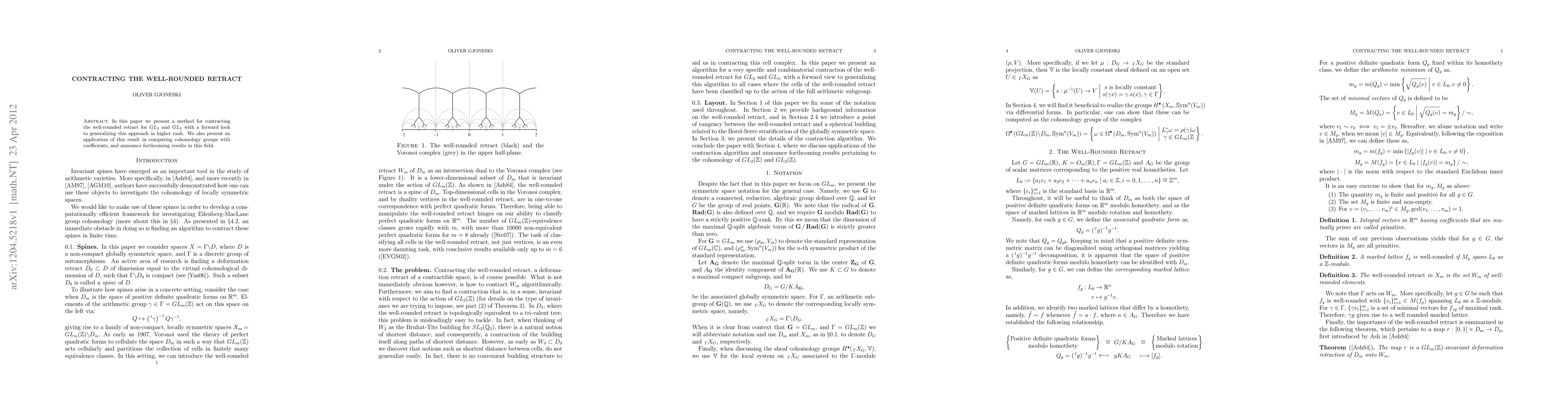 In this paper we present a method for contracting the well-rounded retract in rank one and two, with a forward look to generalizing this approach in higher rank. We also present an application of this result in computing cohomology groups with coefficients, and announce forthcoming results in this field.