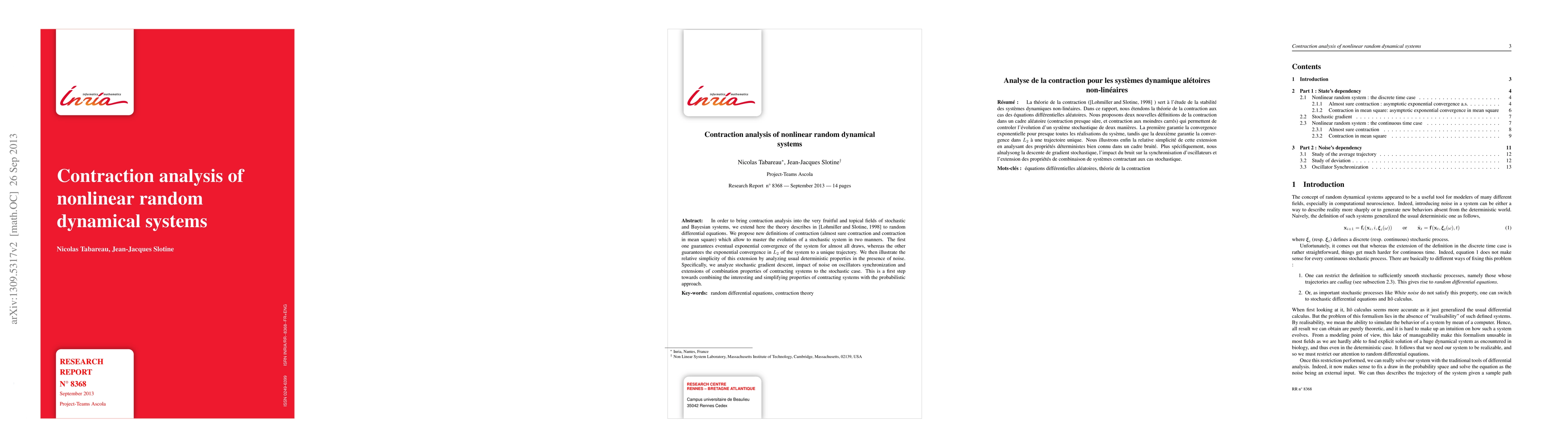 In order to bring contraction analysis into the very fruitful and topical fields of stochastic and Bayesian systems, we extend here the theory describes in \cite{Lohmiller98} to random differential equations. We propose new definitions of contraction (almost sure contraction and contraction in mean square) which allow to master the evolution of a stochastic system in two manners. The first one guarantees eventual exponential convergence of the system for almost all draws, whereas the other guarantees the exponential convergence in $L_2$ of to a unique trajectory. We then illustrate the relative simplicity of this extension by analyzing usual deterministic properties in the presence of noise. Specifically, we analyze stochastic gradient descent, impact of noise on oscillators synchronization and extensions of combination properties of contracting systems to the stochastic case. This is a first step towards combining the interesting and simplifying properties of contracting systems with the probabilistic approach.