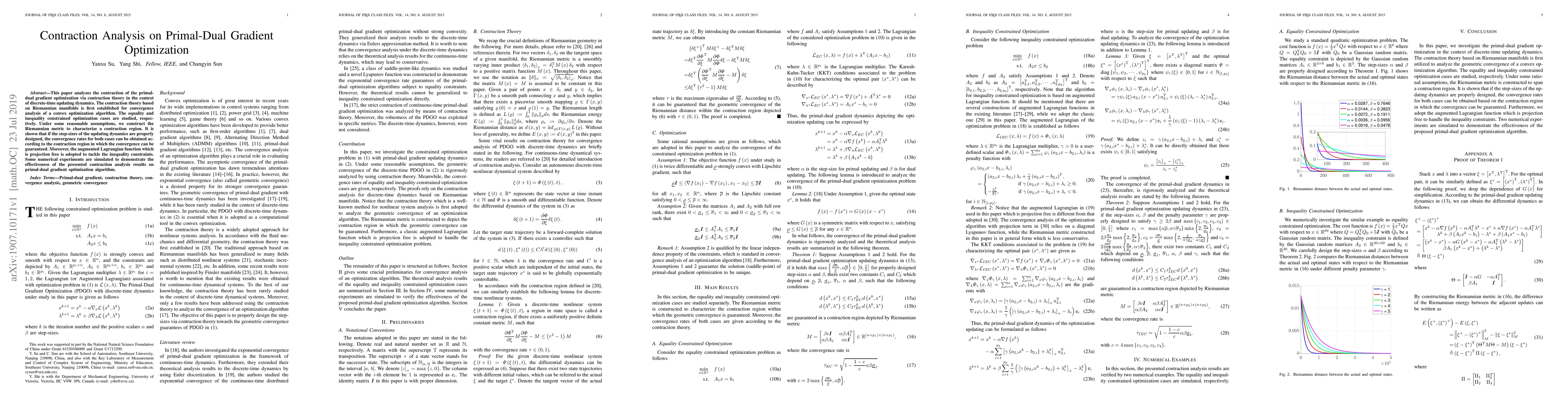 This paper employs contraction theory on Riemannian manifolds to analyze the convergence of primal-dual gradient optimization for both equality and inequality constrained optimization problems. It demonstrates that proper step-sizes can ensure convergence rates, and numerical experiments validate the theoretical findings.